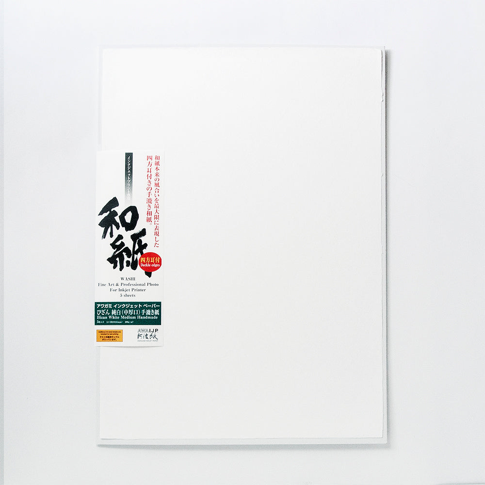 職人が一枚ずつ作った、デジタル印刷用の手漉き和紙です。四辺に「耳」があり、和紙本来の風合いを最大限に表現しています。厚手の紙で、額装することなくそのまま作品として展示できます。写真や絵画の印刷、ミクストメディアなどに適しています。