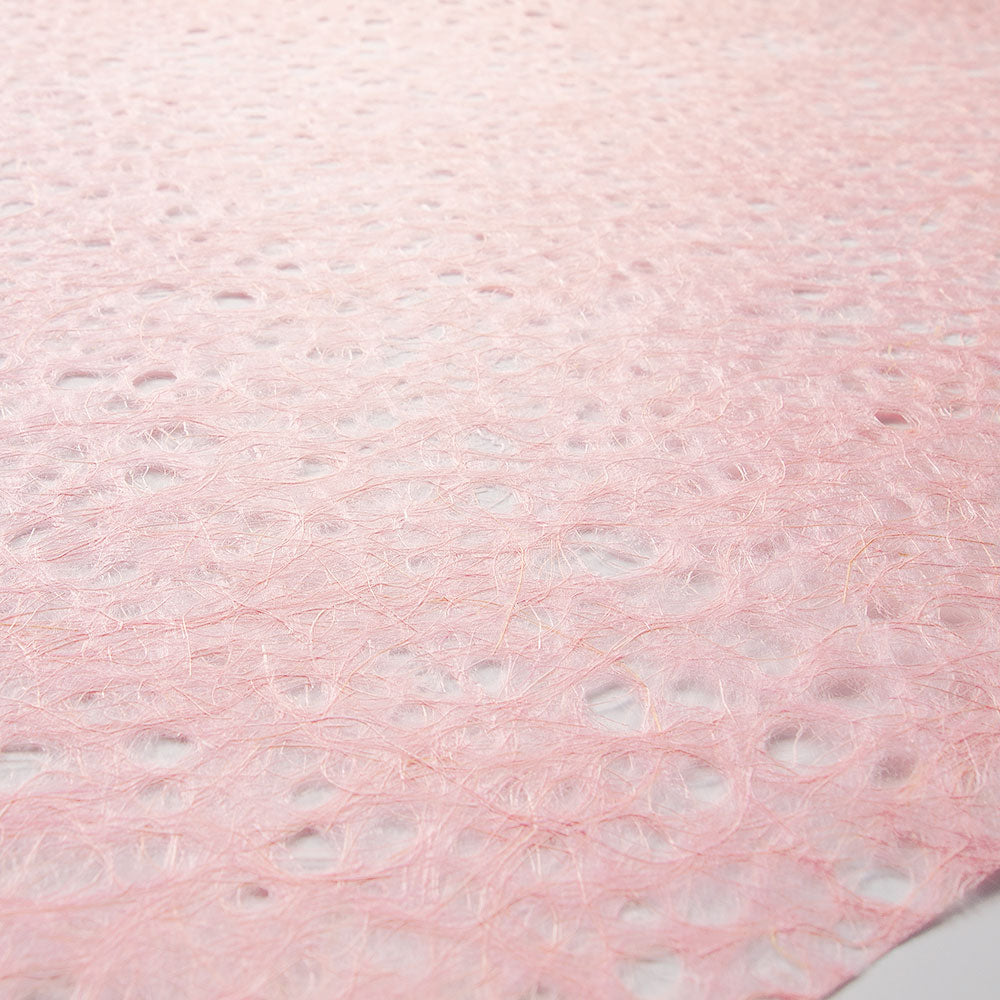 麻の繊維は、自然な光沢感があり、穴を開けることで、涼しげな印象の紙に仕上がっています。透ける利点を活かし、あかりや、障子、ガラス貼りなどのインテリアに、また、花材やボトル等のラッピングには中身が透けてきれいです。四方耳切。桃色。全14色。※こちらの色は半裁サイズになります