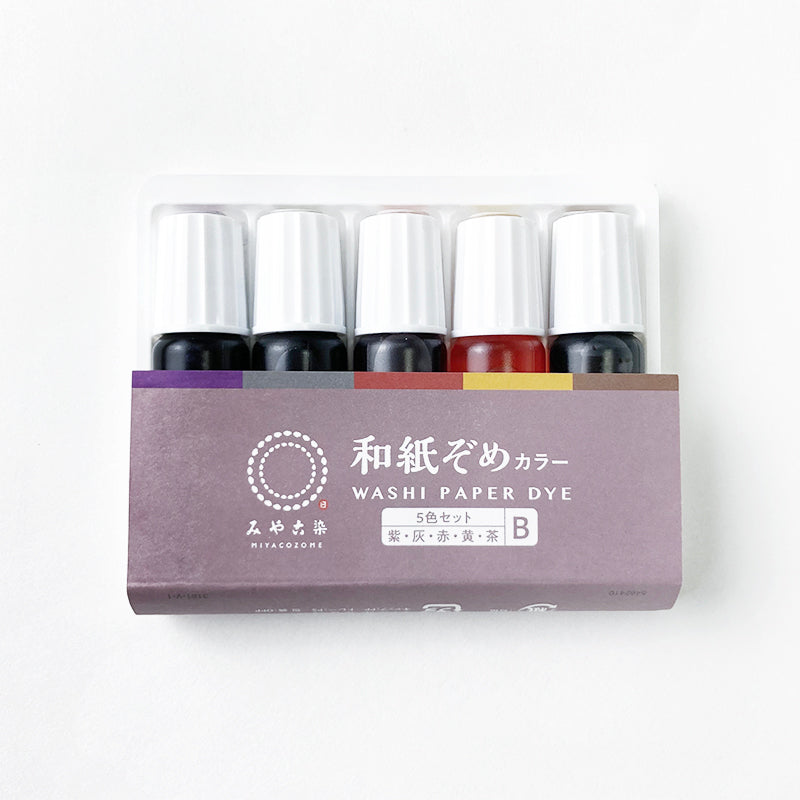 セット内容:液体染料(9㎖)×5色A(緑・青・赤・黄・橙)、または、B(紫・灰・赤・黄・茶) 容器:ポリ瓶入り 染められる目安:浸し染め 半紙9~14枚(1本)