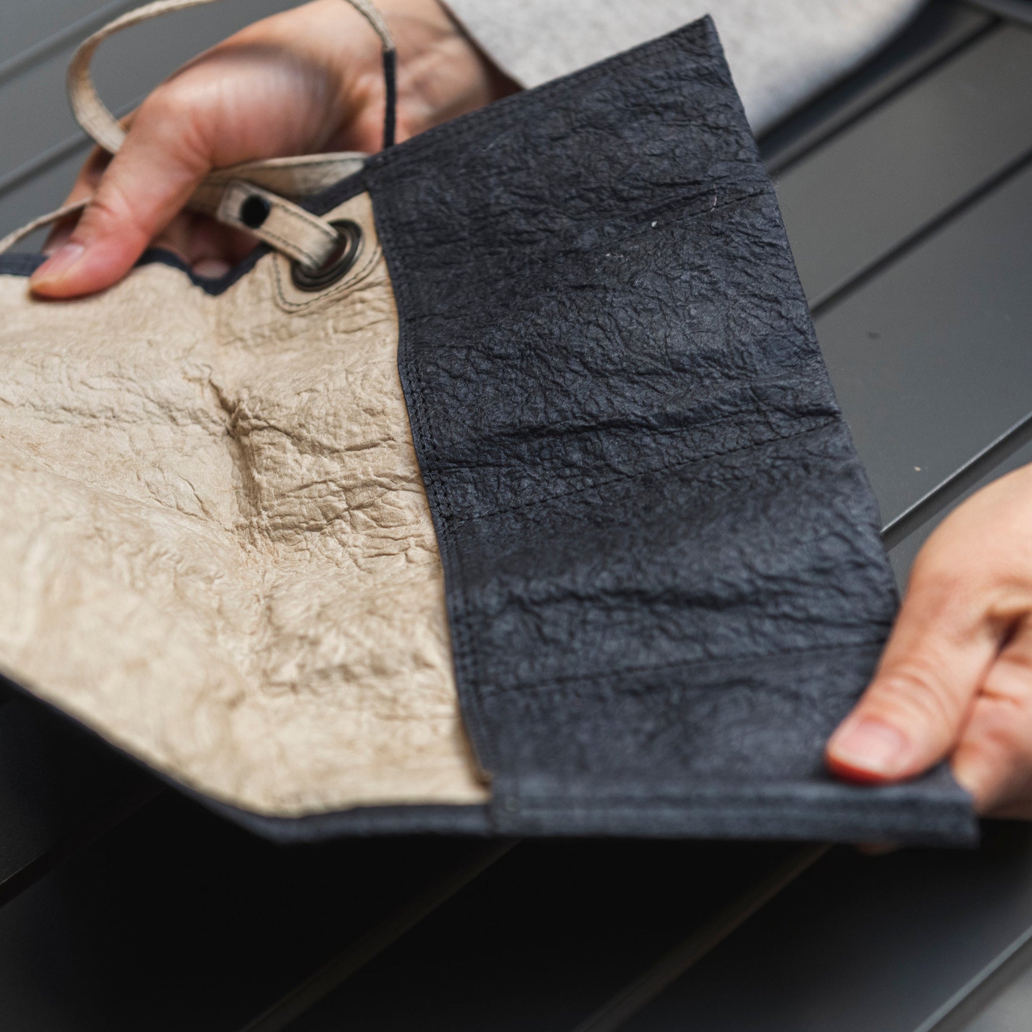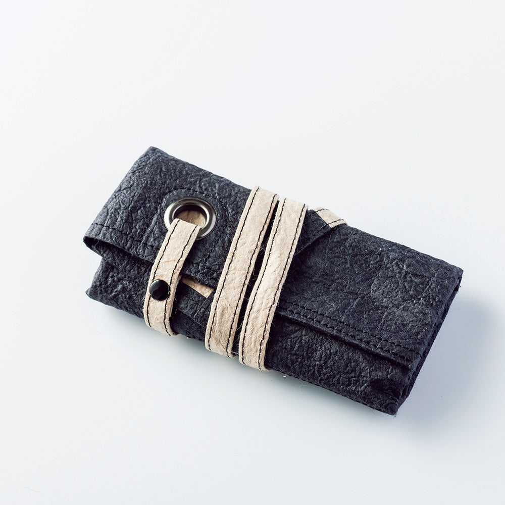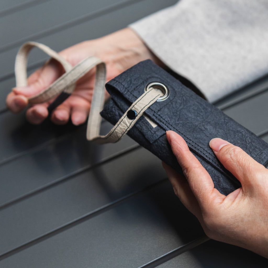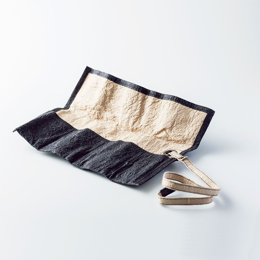 さらりとした手触りながら使い込んだ革のように手にしっくりと馴染み、その感触はやわらかく心地良く、軽やかで、そしてタフ。和紙そのものを身につける心地よさを、感性で愉しんでいただきたいアイテムです。