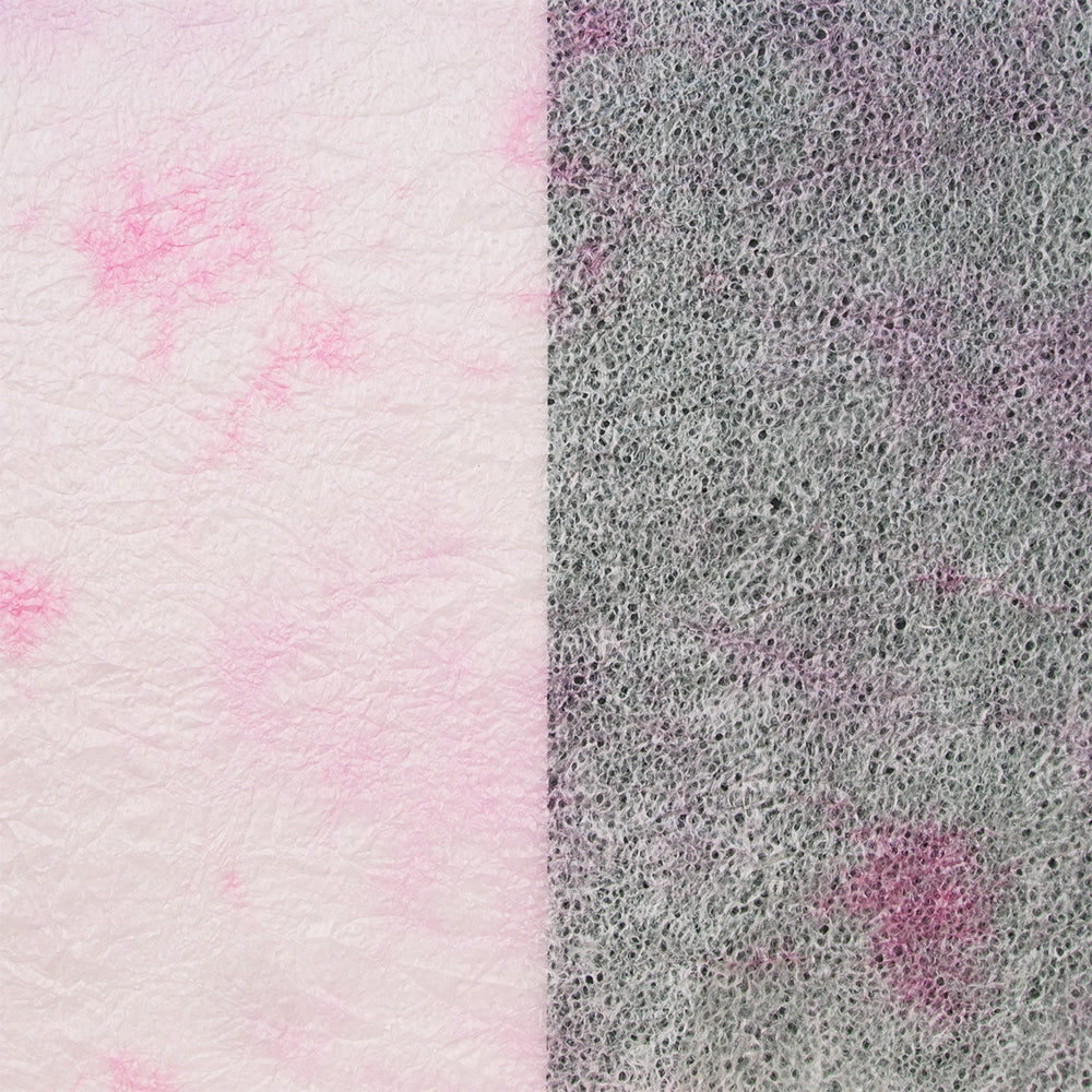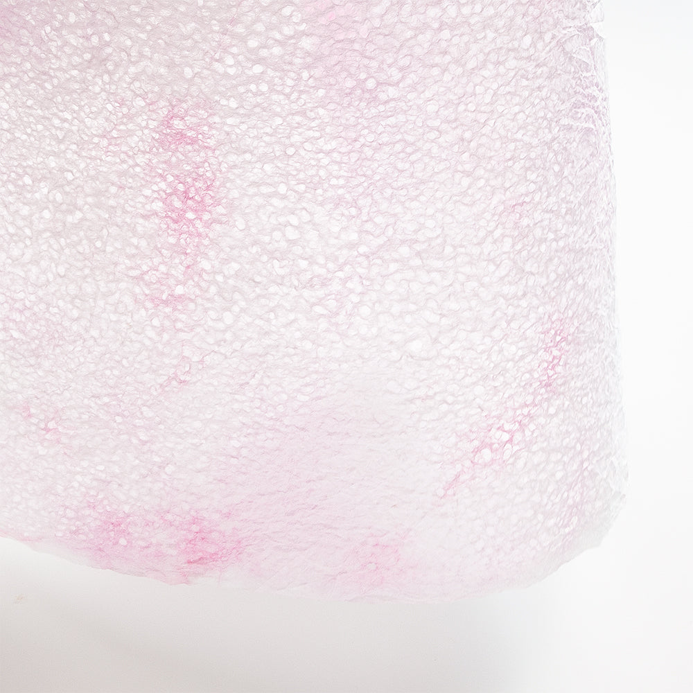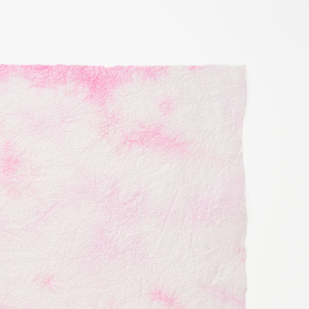 春雨が落ちたような小さな穴があいた紙「春雨紙」。その春雨紙を2〜3色の染料を使って染めました。手でちぎりやすく、「ちぎり絵」「押し花の背景用紙」をはじめ、「ラッピング」や「灯り」など、用途は多様。白のままの原紙もあります。