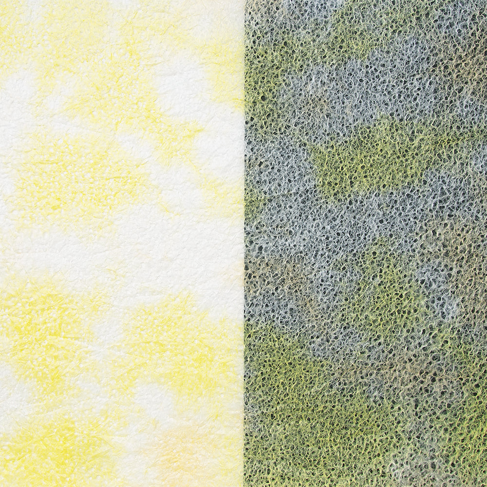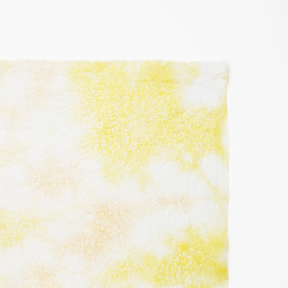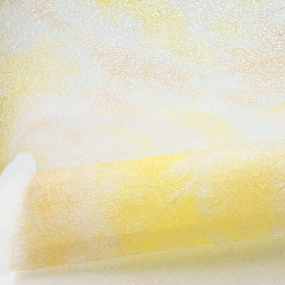 春雨が落ちたような小さな穴があいた紙「春雨紙」。その春雨紙を2〜3色の染料を使って染めました。手でちぎりやすく、「ちぎり絵」「押し花の背景用紙」をはじめ、「ラッピング」や「灯り」など、用途は多様。白のままの原紙もあります。