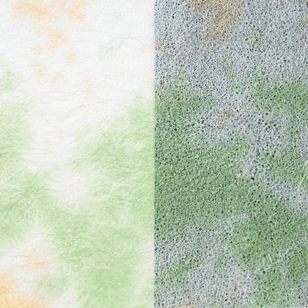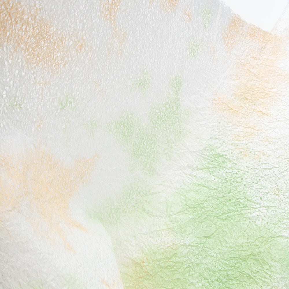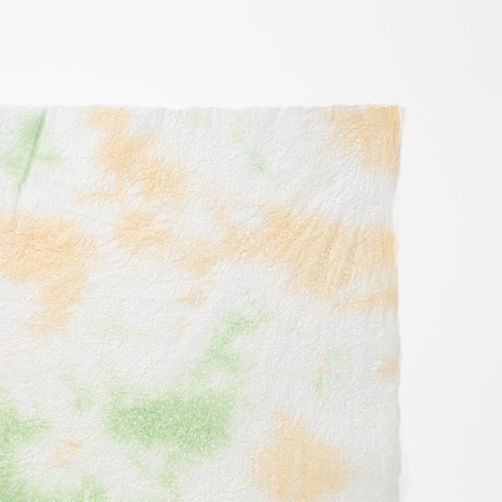 春雨が落ちたような小さな穴があいた紙「春雨紙」。その春雨紙を2〜3色の染料を使って染めました。手でちぎりやすく、「ちぎり絵」「押し花の背景用紙」をはじめ、「ラッピング」や「灯り」など、用途は多様。白のままの原紙もあります。