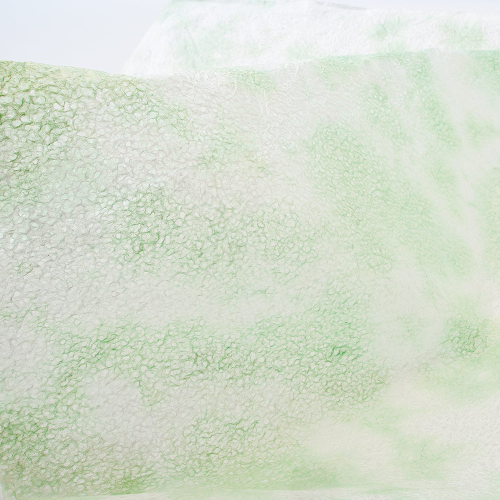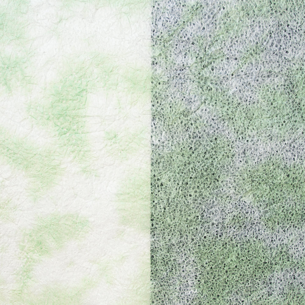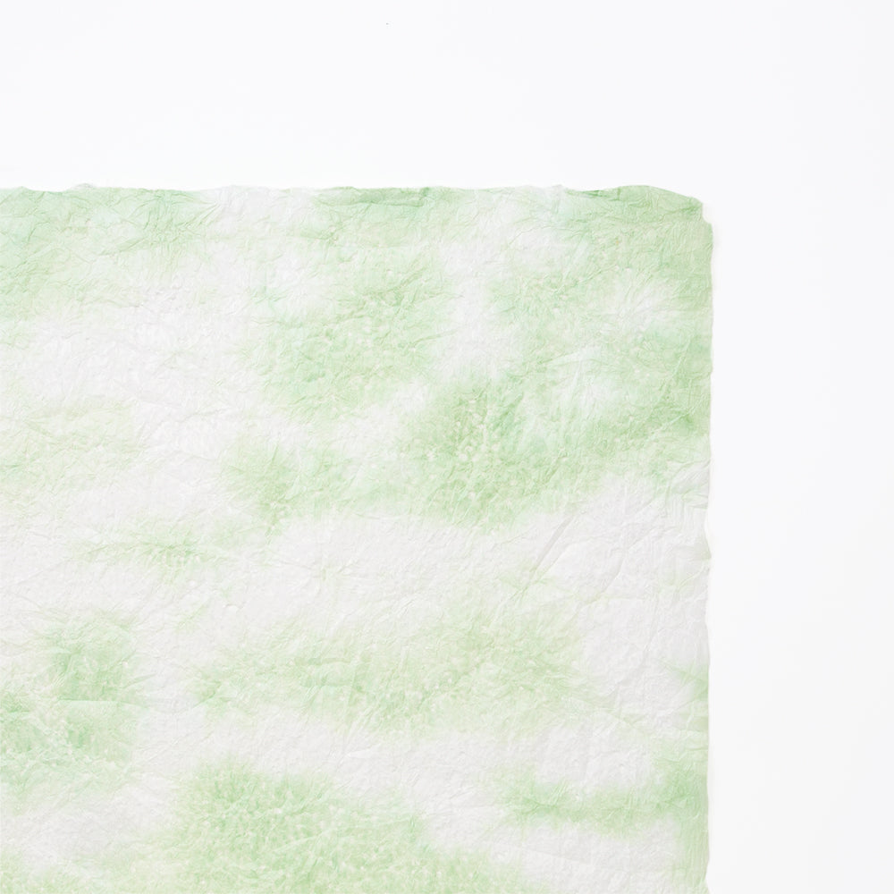 春雨が落ちたような小さな穴があいた紙「春雨紙」。その春雨紙を2〜3色の染料を使って染めました。手でちぎりやすく、「ちぎり絵」「押し花の背景用紙」をはじめ、「ラッピング」や「灯り」など、用途は多様。白のままの原紙もあります。