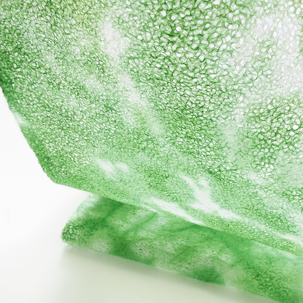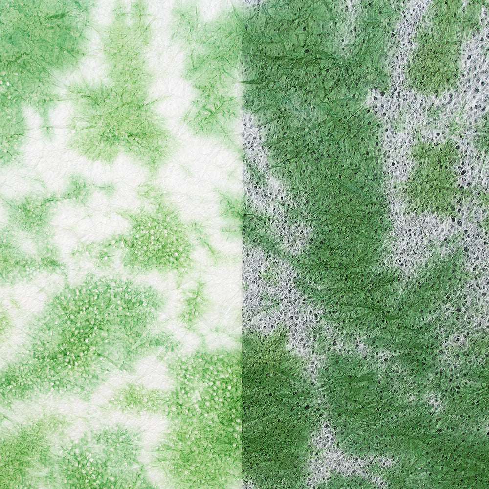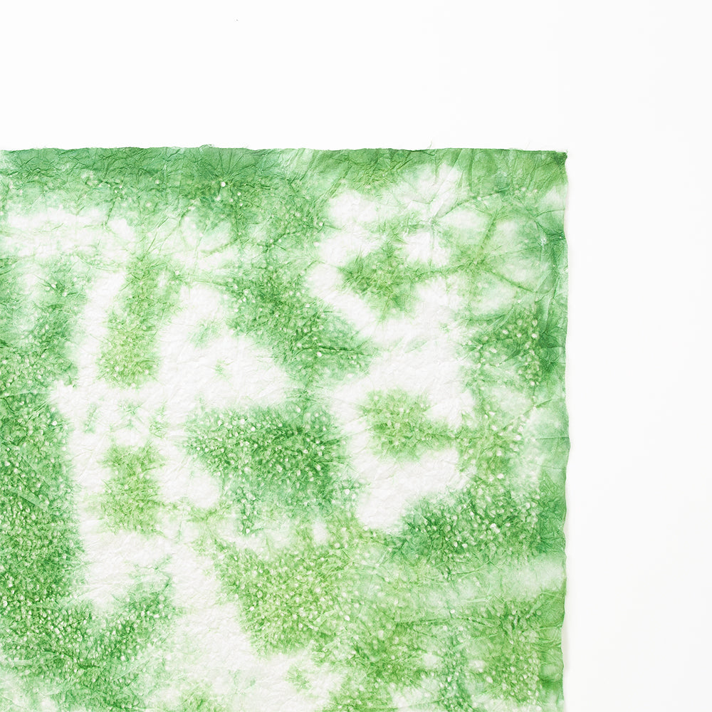 春雨が落ちたような小さな穴があいた紙「春雨紙」。その春雨紙を2〜3色の染料を使って染めました。手でちぎりやすく、「ちぎり絵」「押し花の背景用紙」をはじめ、「ラッピング」や「灯り」など、用途は多様。白のままの原紙もあります。
