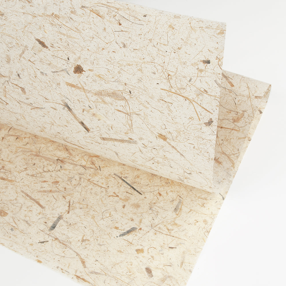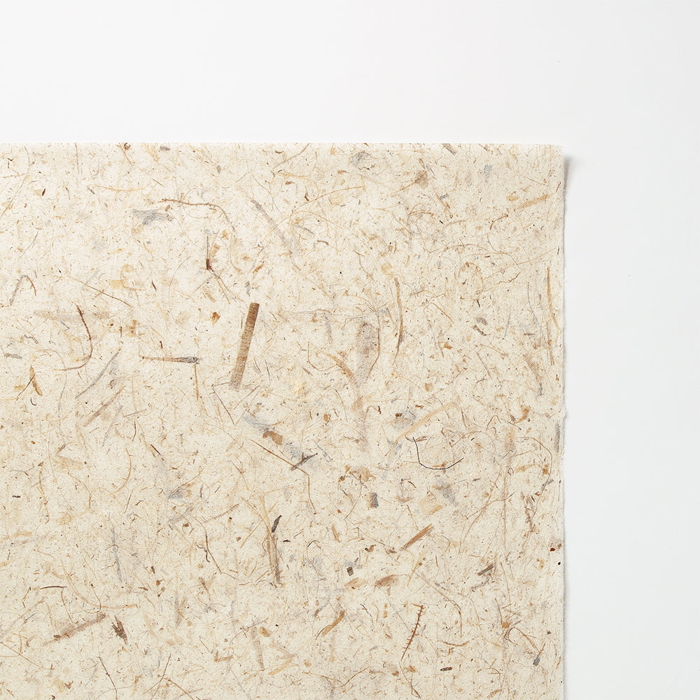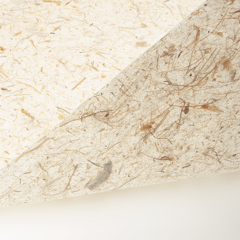 アワガミファクトリーではタイ、ネパールの紙など日本の和紙以外の紙を輸入し、日本でご紹介&販売もしています。 ナチュラルな素材を使った紙、日本人の感覚では思いつかない手法や色使いなどは、私たち和紙製造メーカーとしても とても勉強になります。お互い切磋琢磨して、お客さまに喜んでいただける紙づくりを目指しています。「バナナ」の皮や葉の繊維を漉き込んだ紙です。 タイ製。