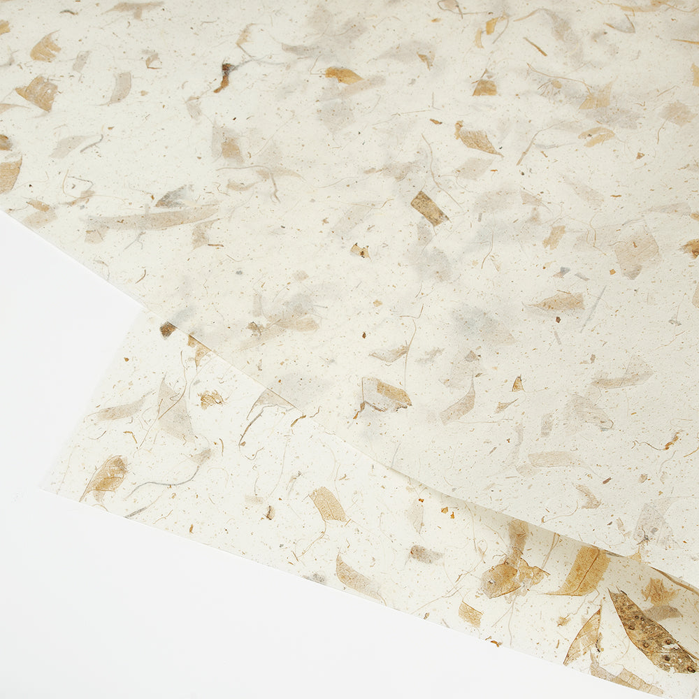 アワガミファクトリーではタイ、ネパールの紙など日本の和紙以外の紙を輸入し、日本でご紹介&販売もしています。 ナチュラルな素材を使った紙、日本人の感覚では思いつかない手法や色使いなどは、私たち和紙製造メーカーとしても とても勉強になります。お互い切磋琢磨して、お客さまに喜んでいただける紙づくりを目指しています。「マンゴ」は、マンゴの葉や繊維等を漉き込んだ紙です。 タイ製。こちらは在庫なくなり次第終了となります。