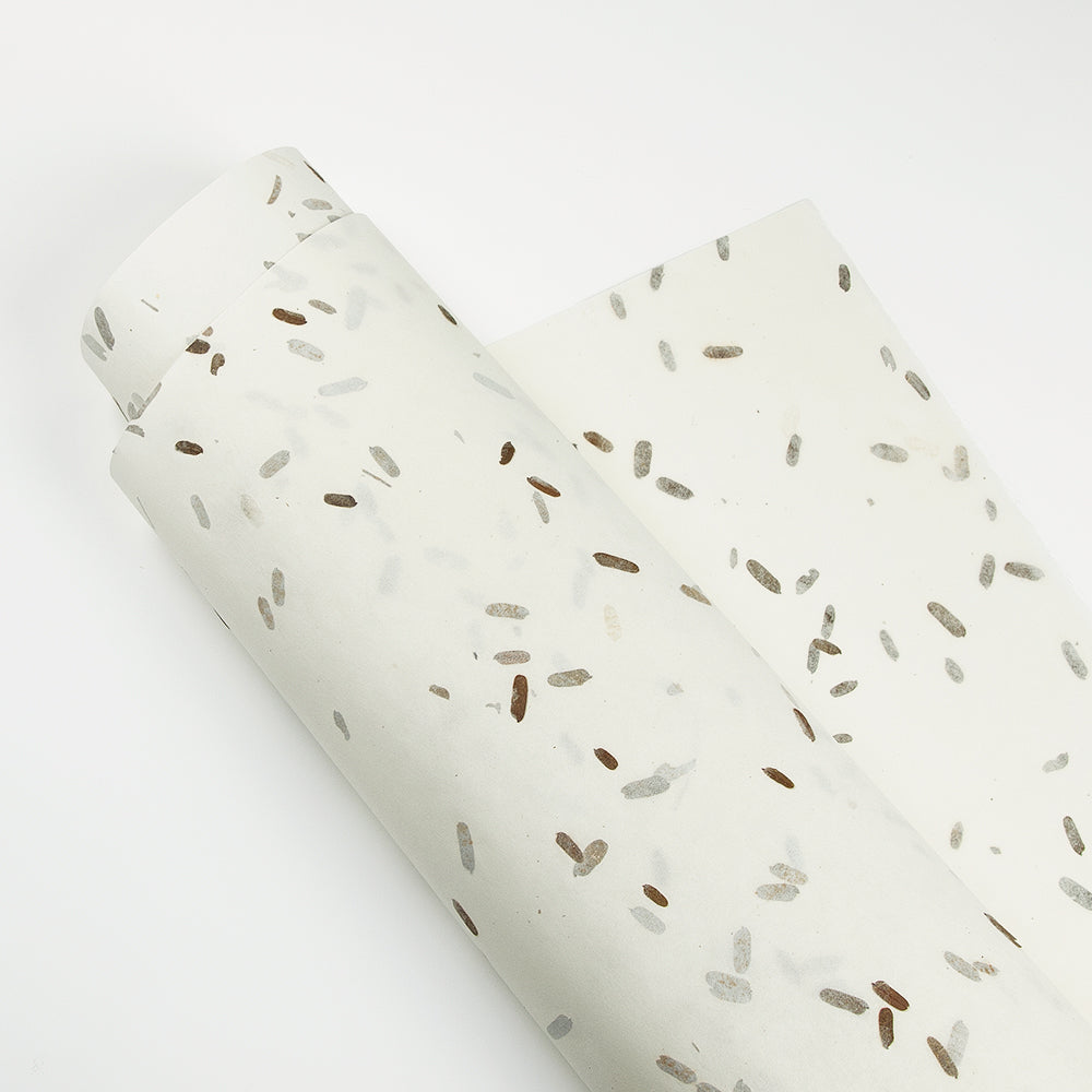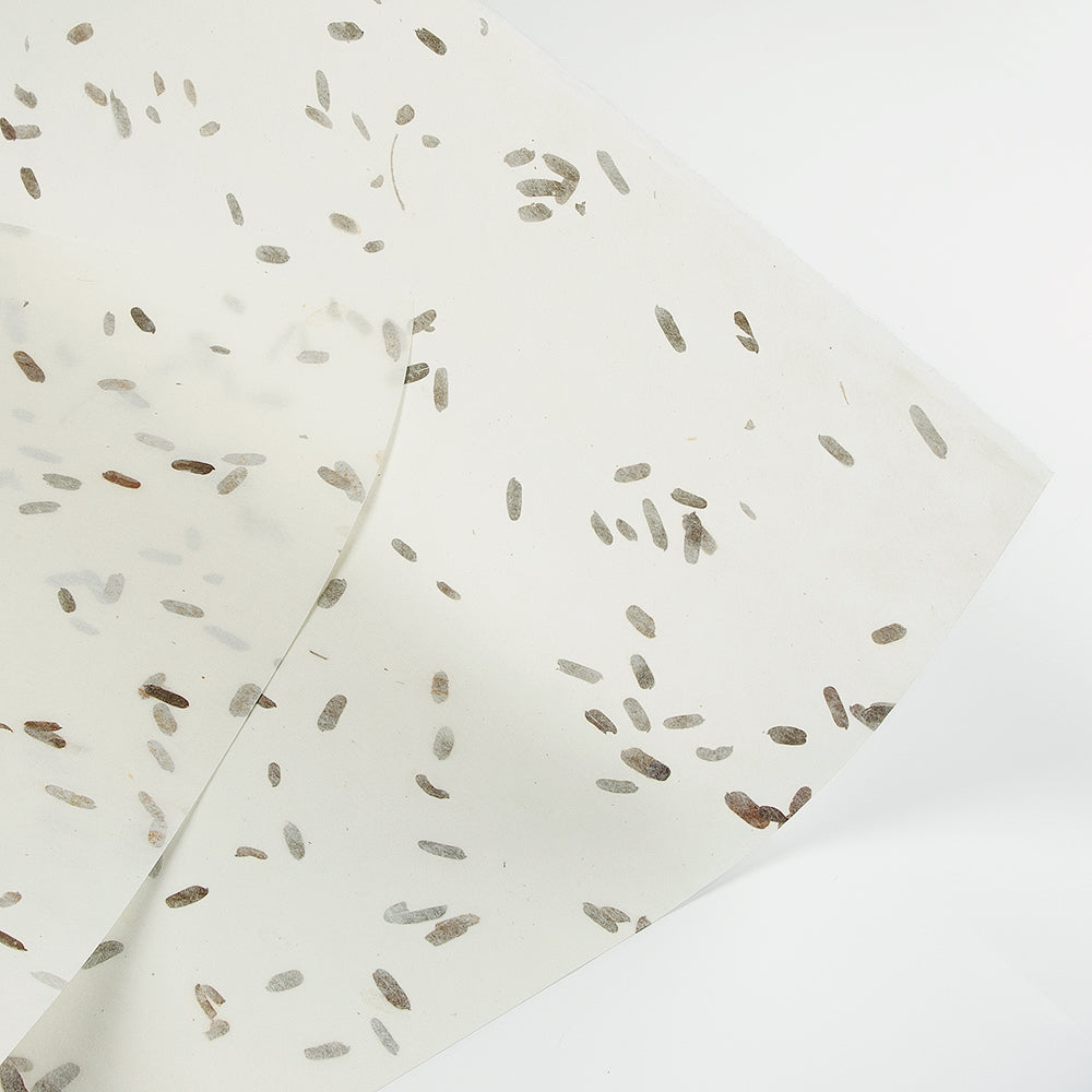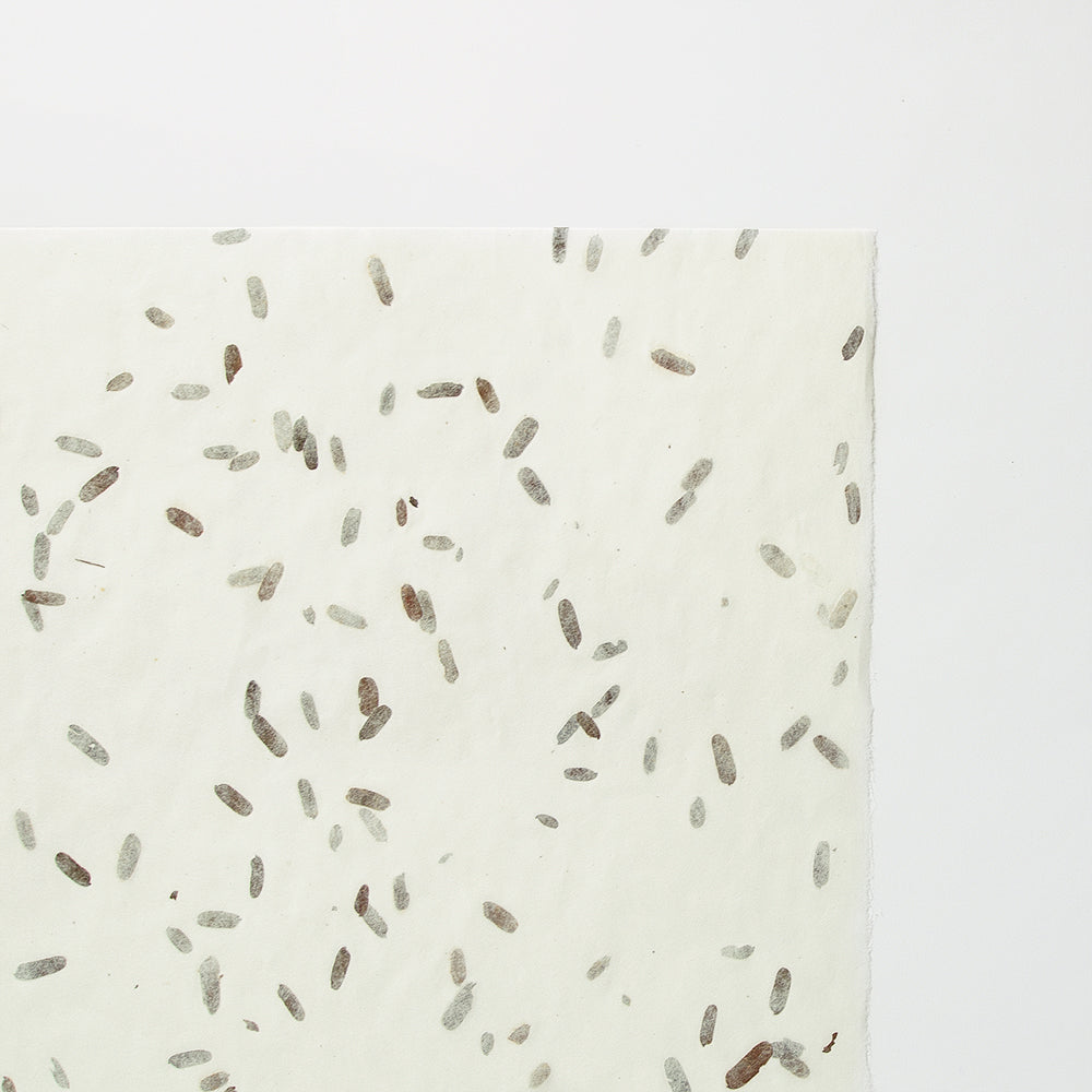 アワガミファクトリーではタイ、ネパールの紙など日本の和紙以外の紙を輸入し、日本でご紹介&販売もしています。 ナチュラルな素材を使った紙、日本人の感覚では思いつかない手法や色使いなどは、私たち和紙製造メーカーとしても とても勉強になります。お互い切磋琢磨して、お客さまに喜んでいただける紙づくりを目指しています。こちらは「タマリンド」の葉を漉き込んだ紙です。 タイ製。