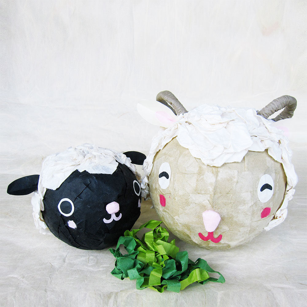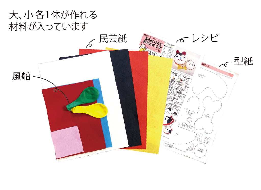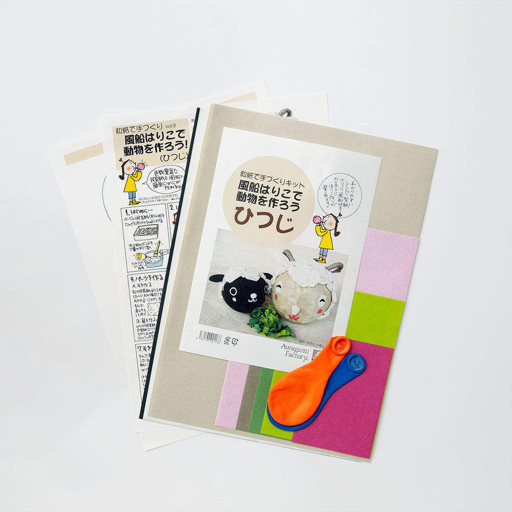 風船を型に民芸紙を使って作る手作りキットです。ひつじが2匹作れるセットになっています。