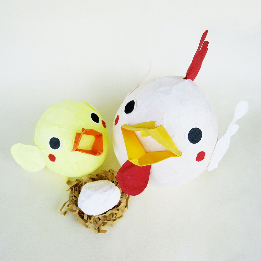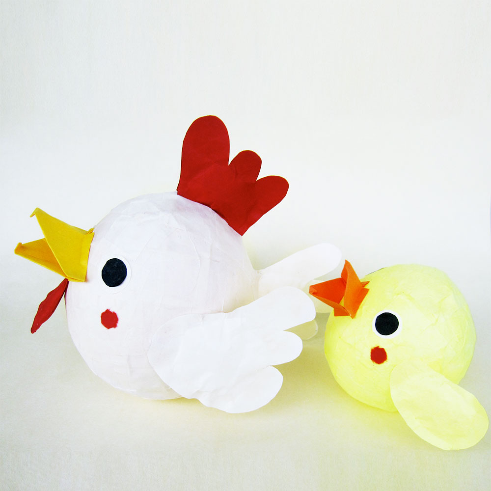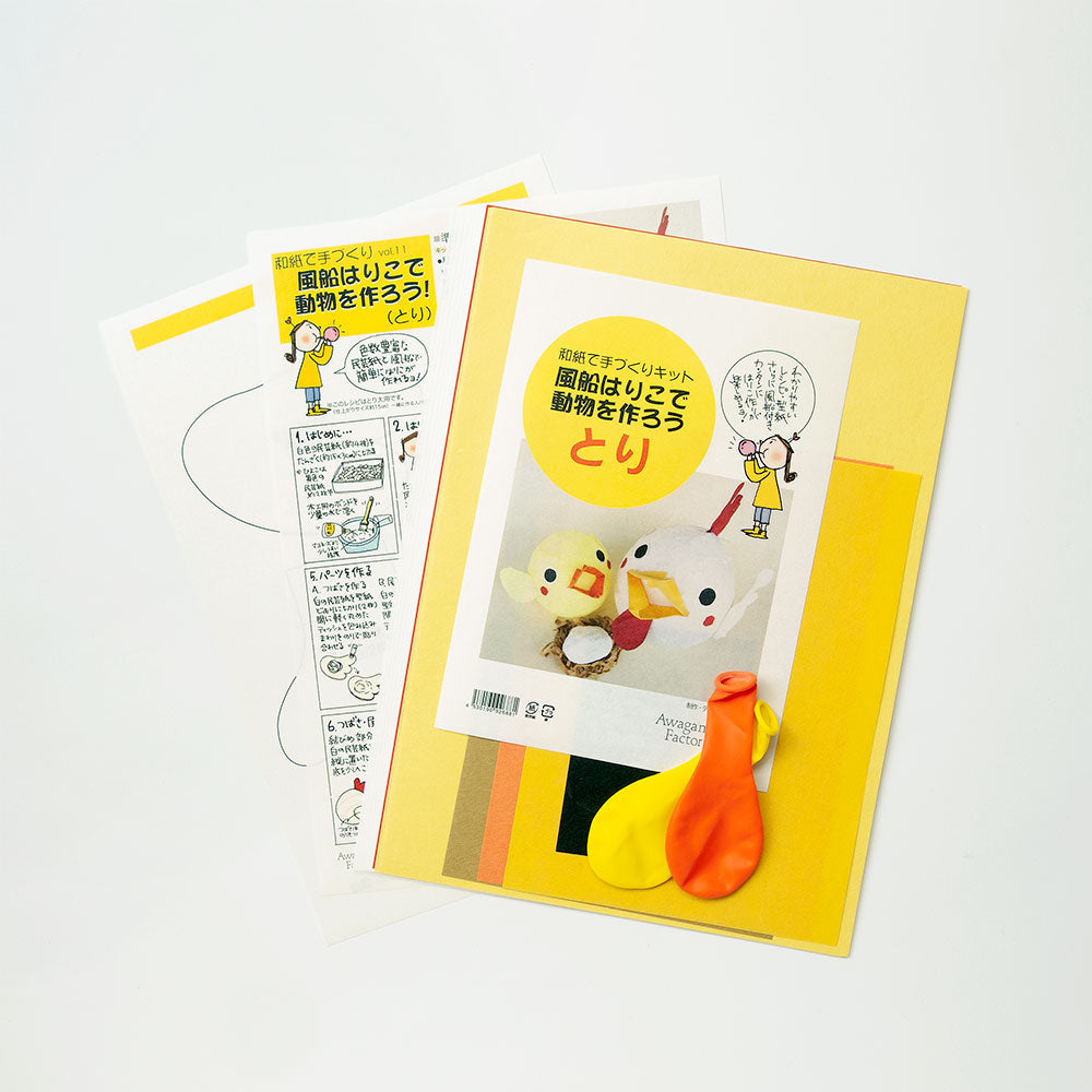 風船を型に民芸紙を使って作る手作りキットです。にわとりとひよこが1匹ずつ作れるセットになっています。