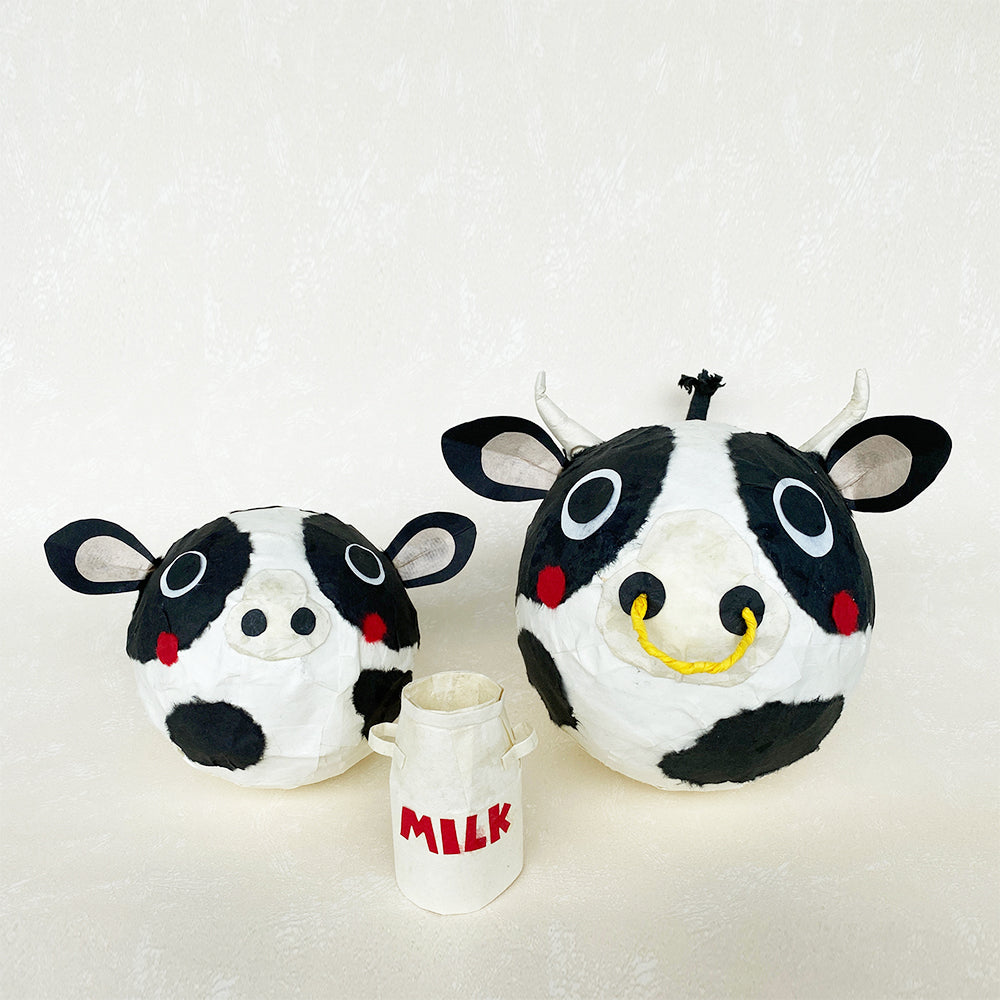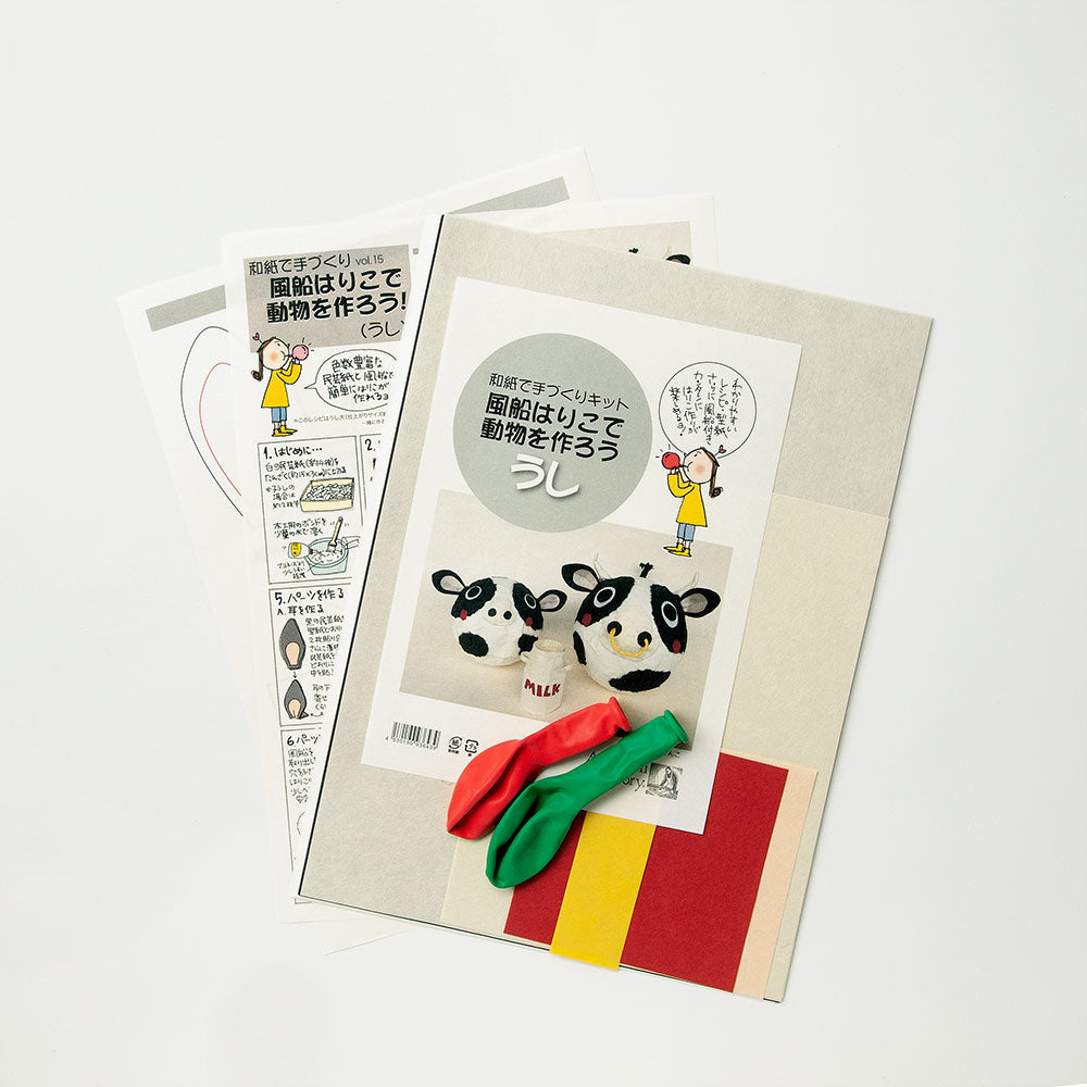 風船を型に民芸紙を使って作る手作りキットです。うしの親子が1匹ずつ作れるセットになっています。