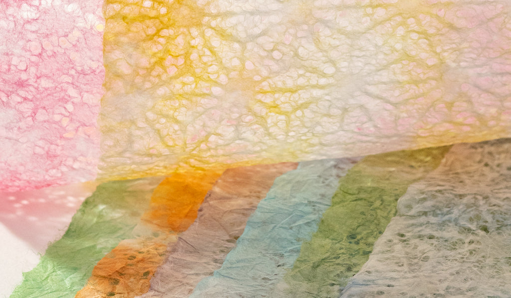 透かし模様が美しいレースペーパーや、空に広がる雲のような地模様のついた「雲柄紙」を、優しい色で染めました。