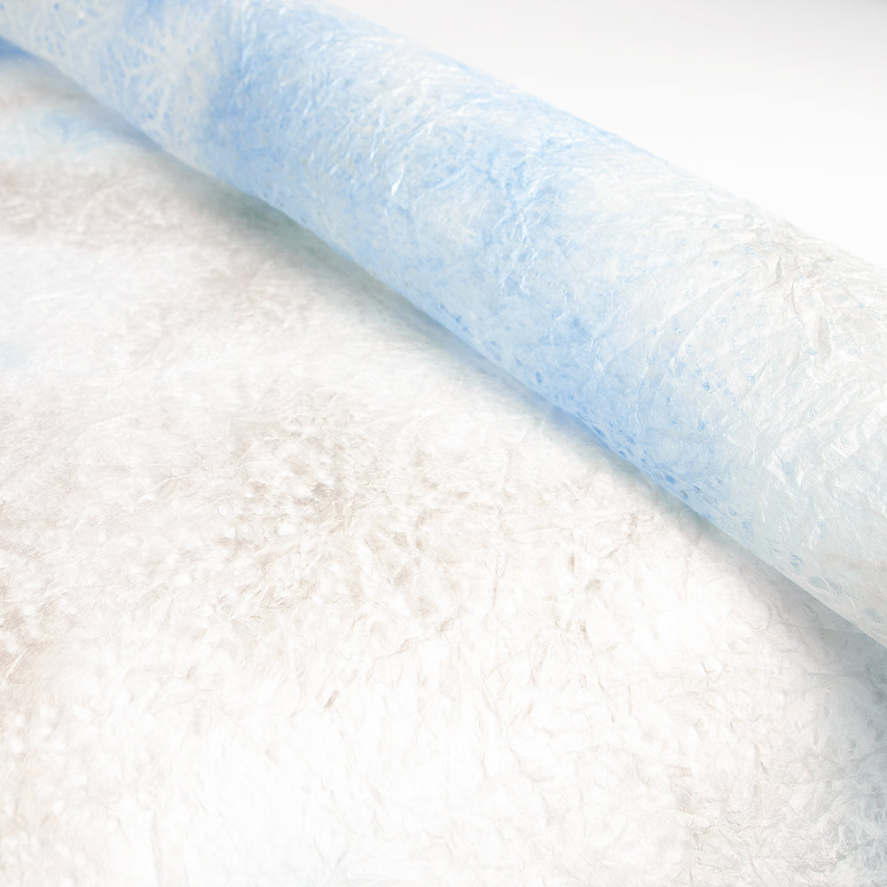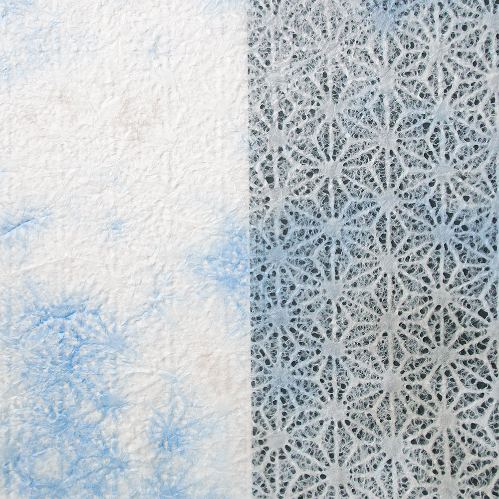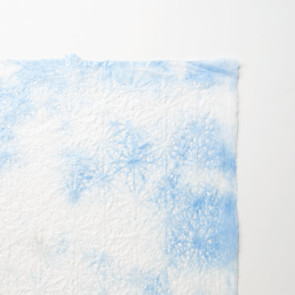 レースのような、麻の葉柄の透かし模様が入った薄い和紙を、淡い青色の染料でもみ染めにしました。ふんわりと柔らかく、優しく光を透かします。