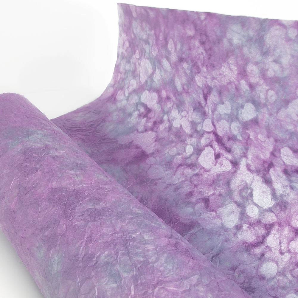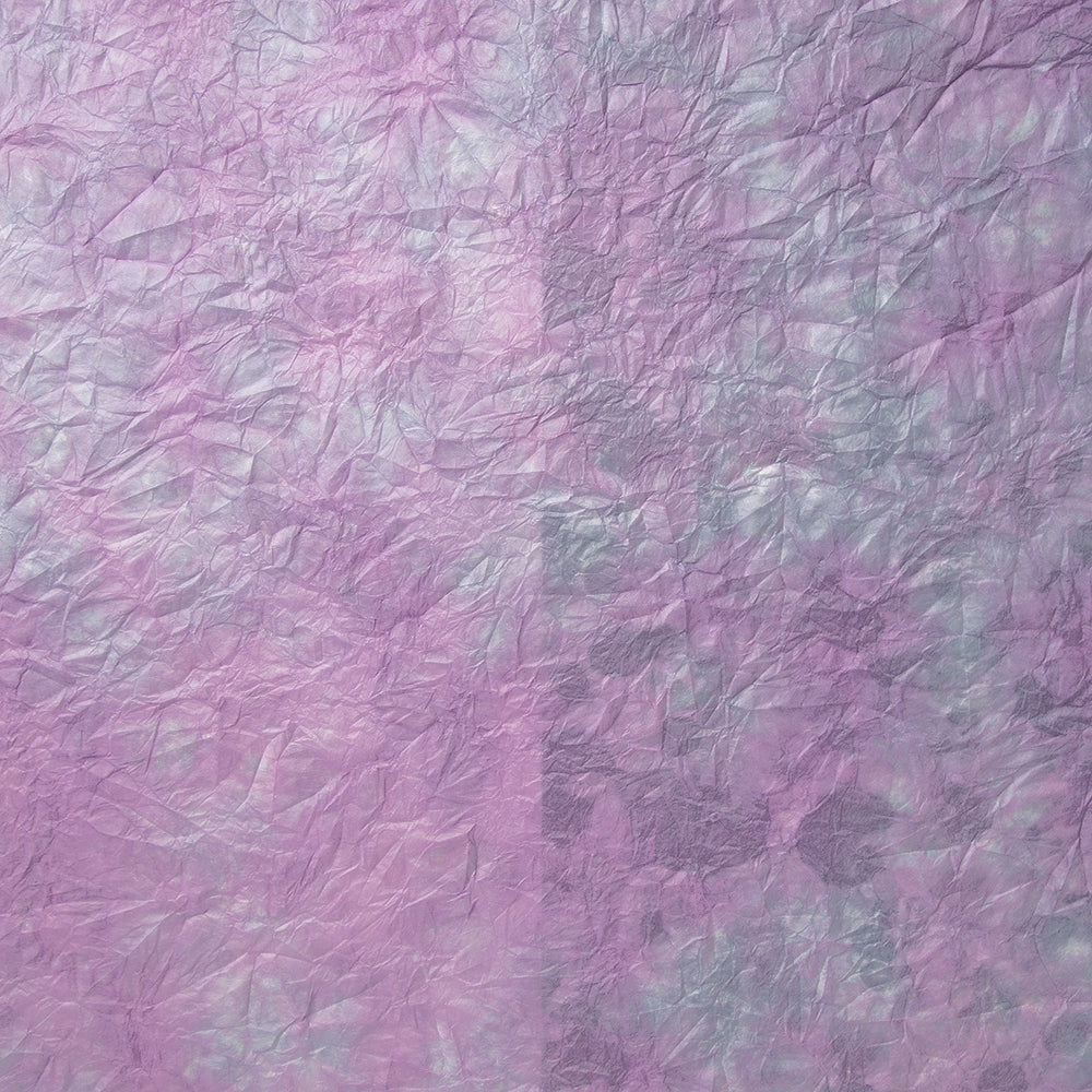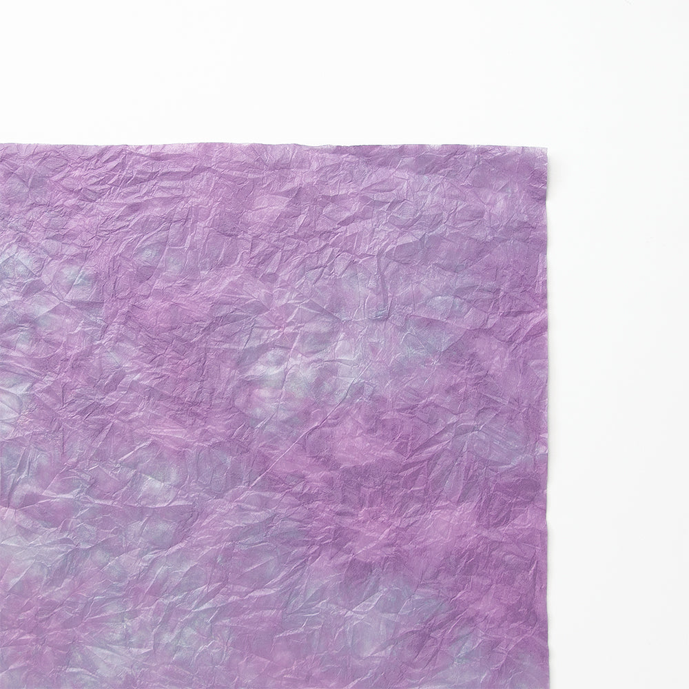 雲が散らばったようなモヤモヤ模様の和紙をもみ染めにしました。細かく砕いた繊維を漉き込むことで、雲のような模様になっています。