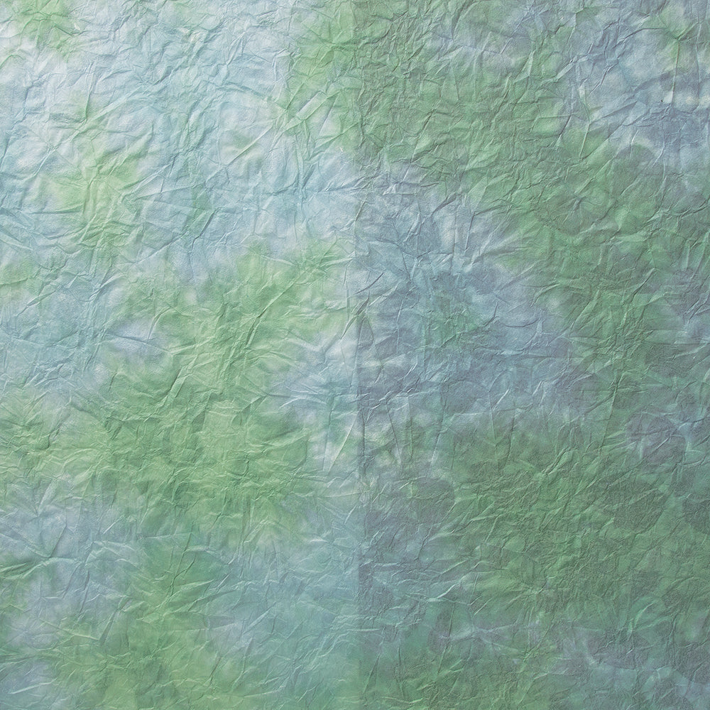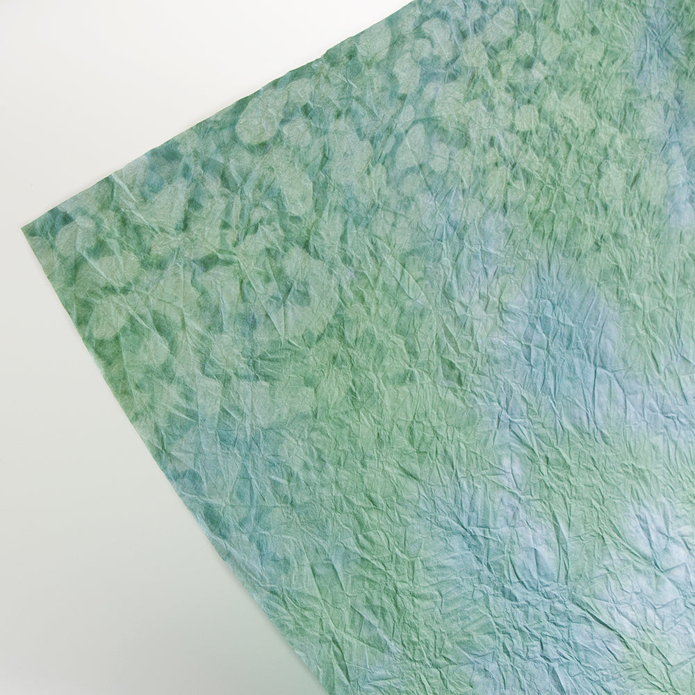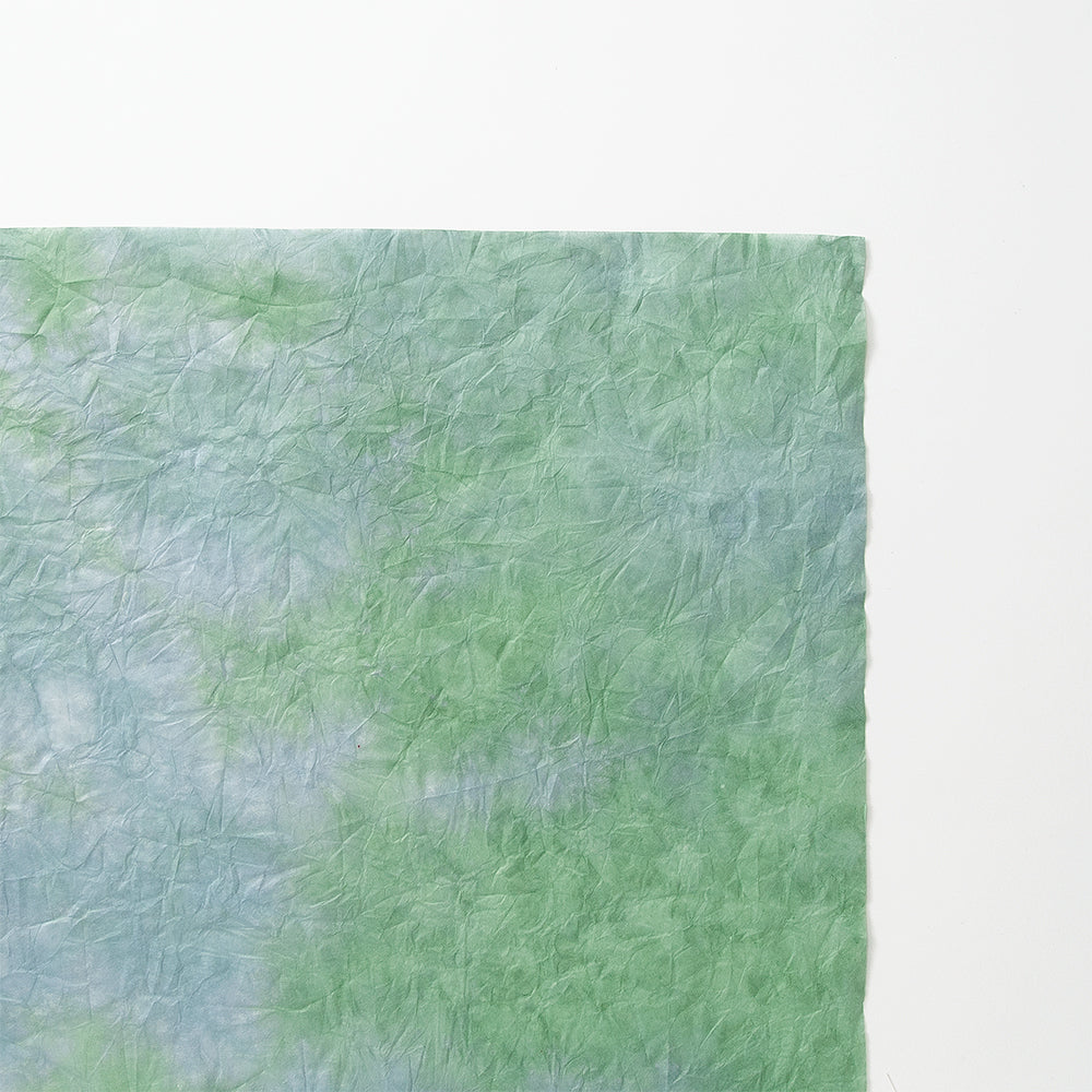 雲が散らばったようなモヤモヤ模様の和紙をもみ染めにしました。細かく砕いた繊維を漉き込むことで、雲のような模様になっています。