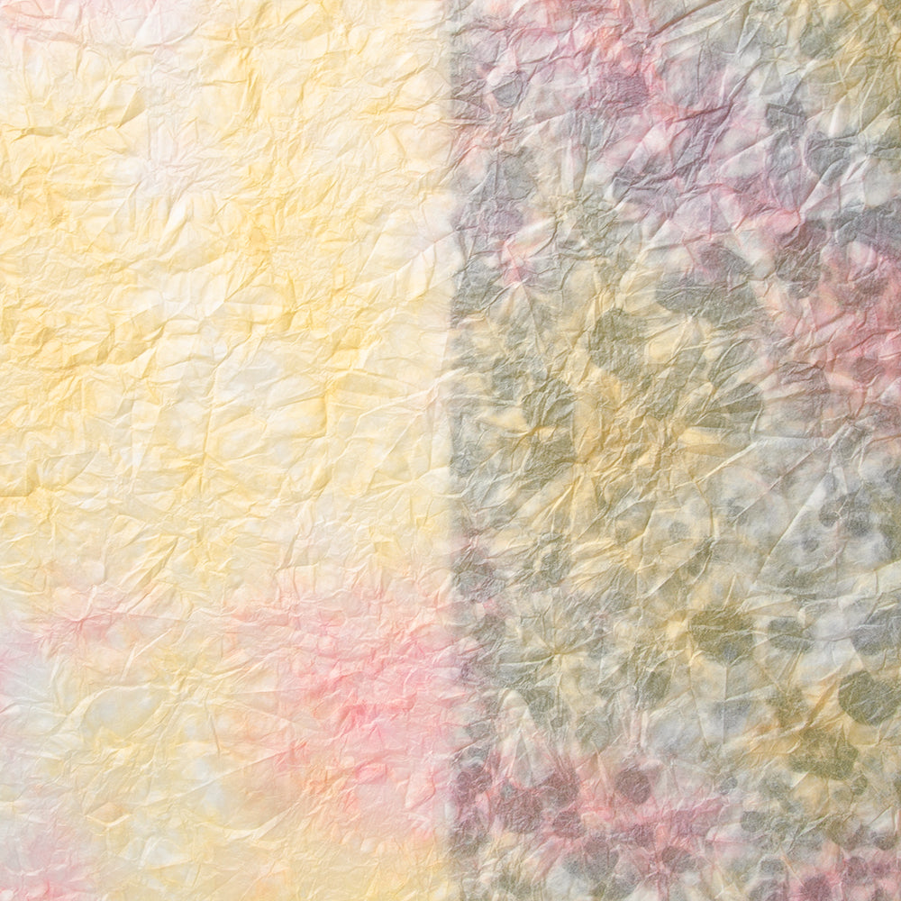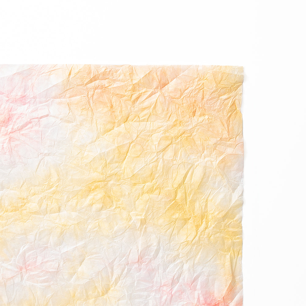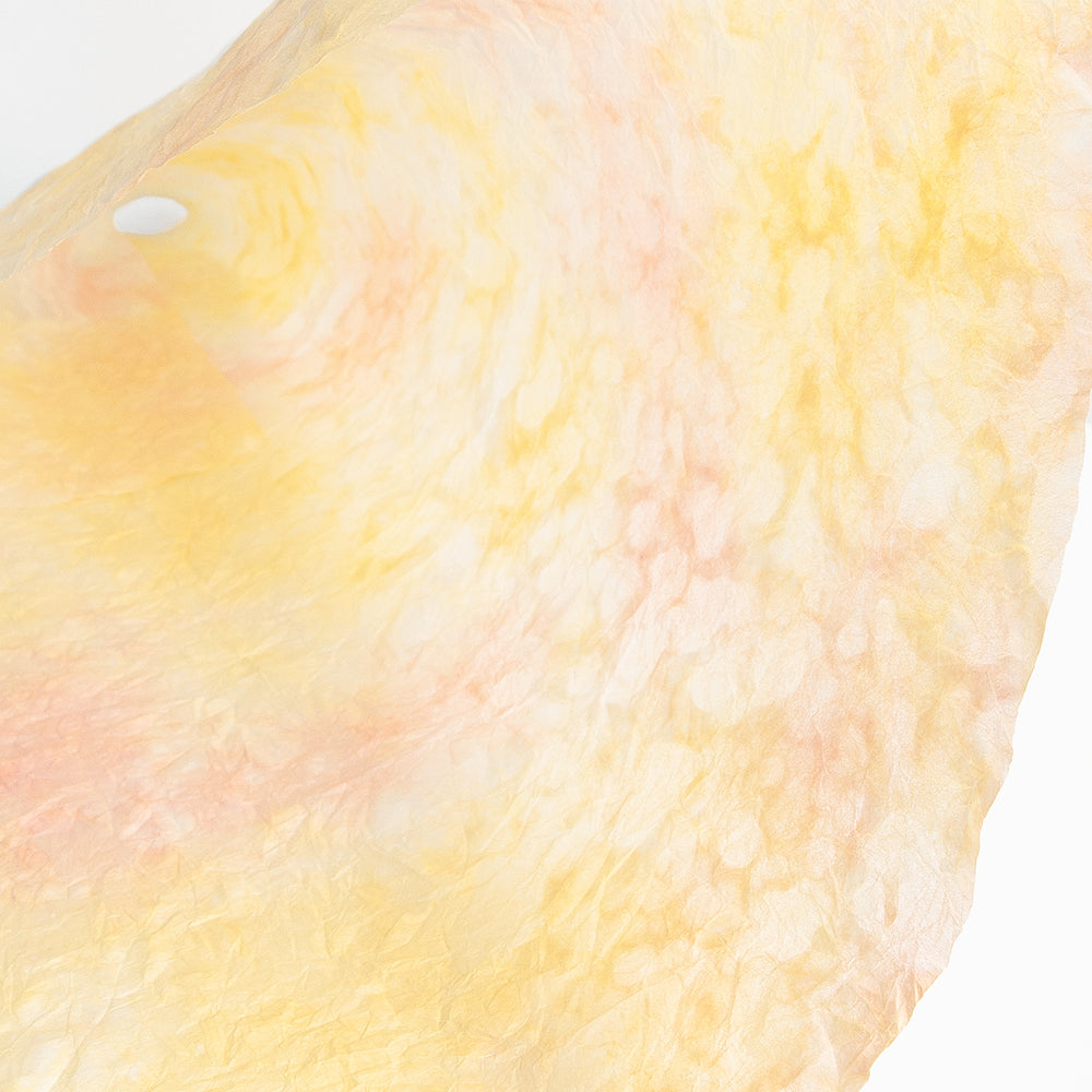 雲が散らばったようなモヤモヤ模様の和紙をもみ染めにしました。細かく砕いた繊維を漉き込むことで、雲のような模様になっています。