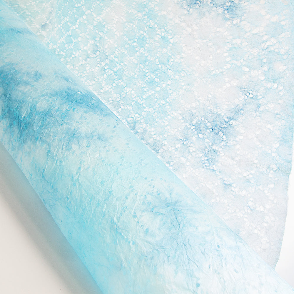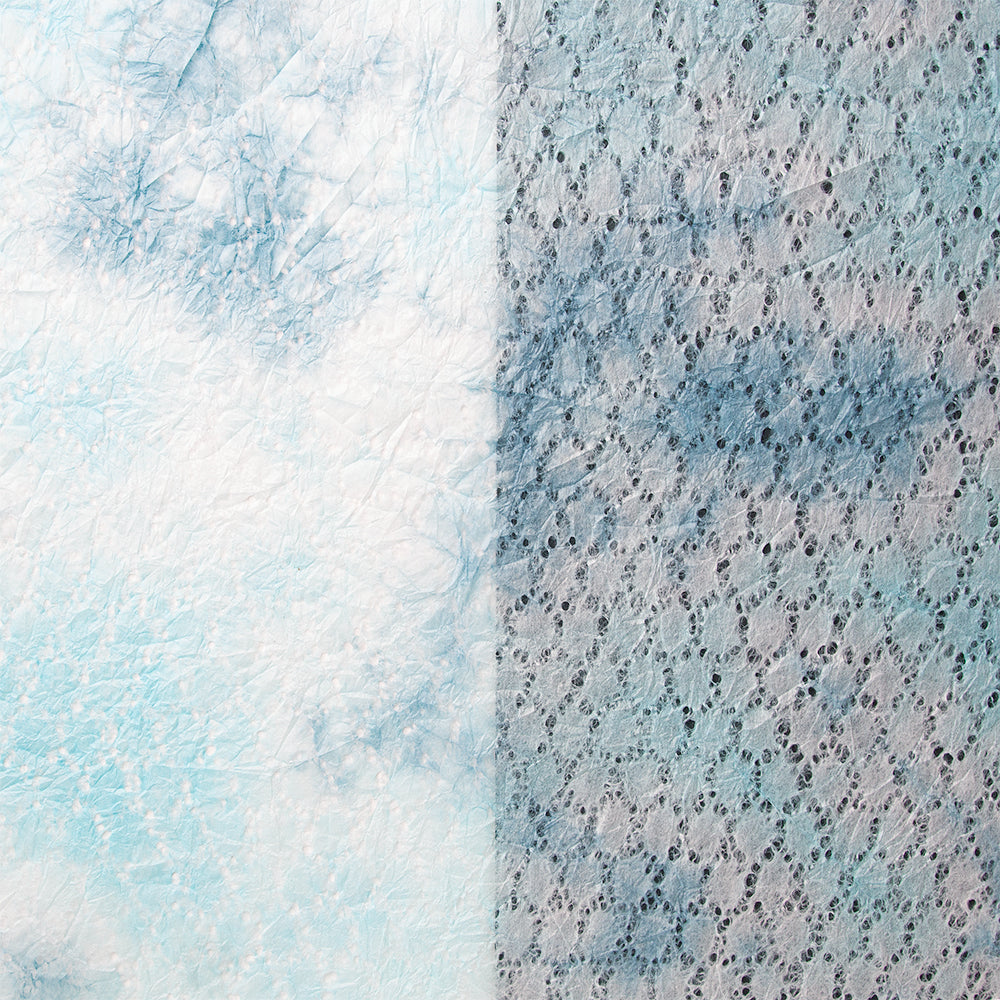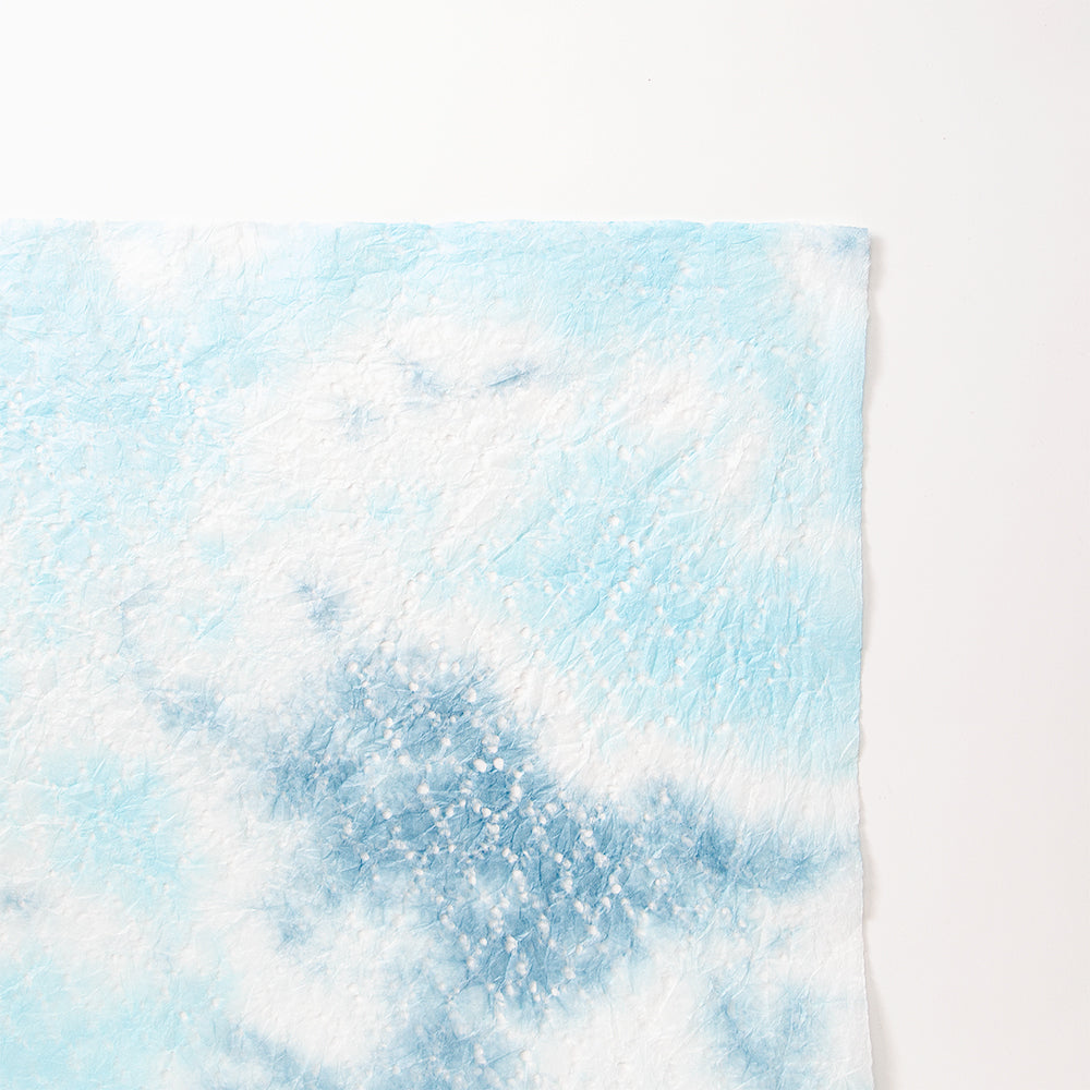 レースのような、亀甲柄の透かし模様が入った薄い和紙を、青色の染料でもみ染めにしました。ふんわりと柔らかく、優しく光を透かします。