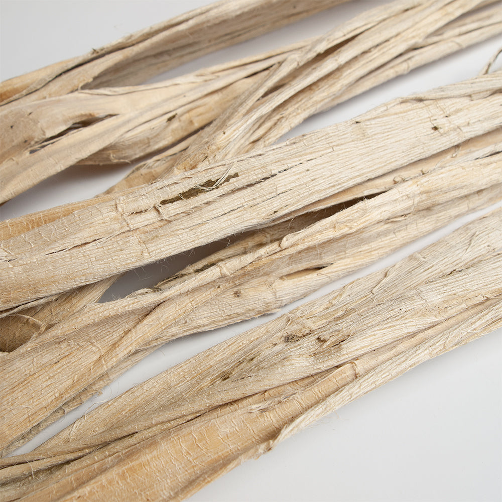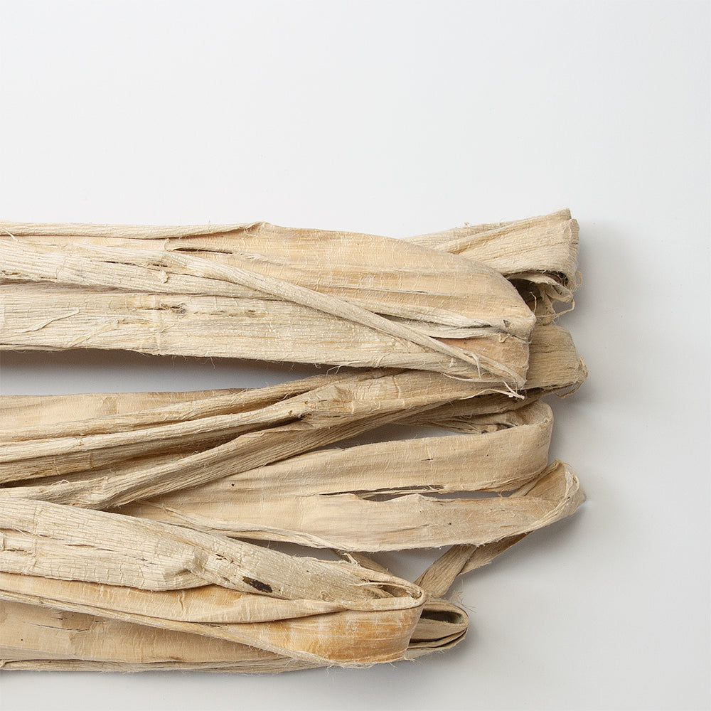 黒皮、青皮を取り除いた、楮の白皮の原料。乾燥した状態でお届けします。ご自分で原料を煮熟するところから紙漉きが体験できます。→「和紙の製造工程」の「原料の煮熟」をご覧下さい。およそ1mくらいの長さのものが20本程度入っています。天然のものですのでその時によって状態は異なります。