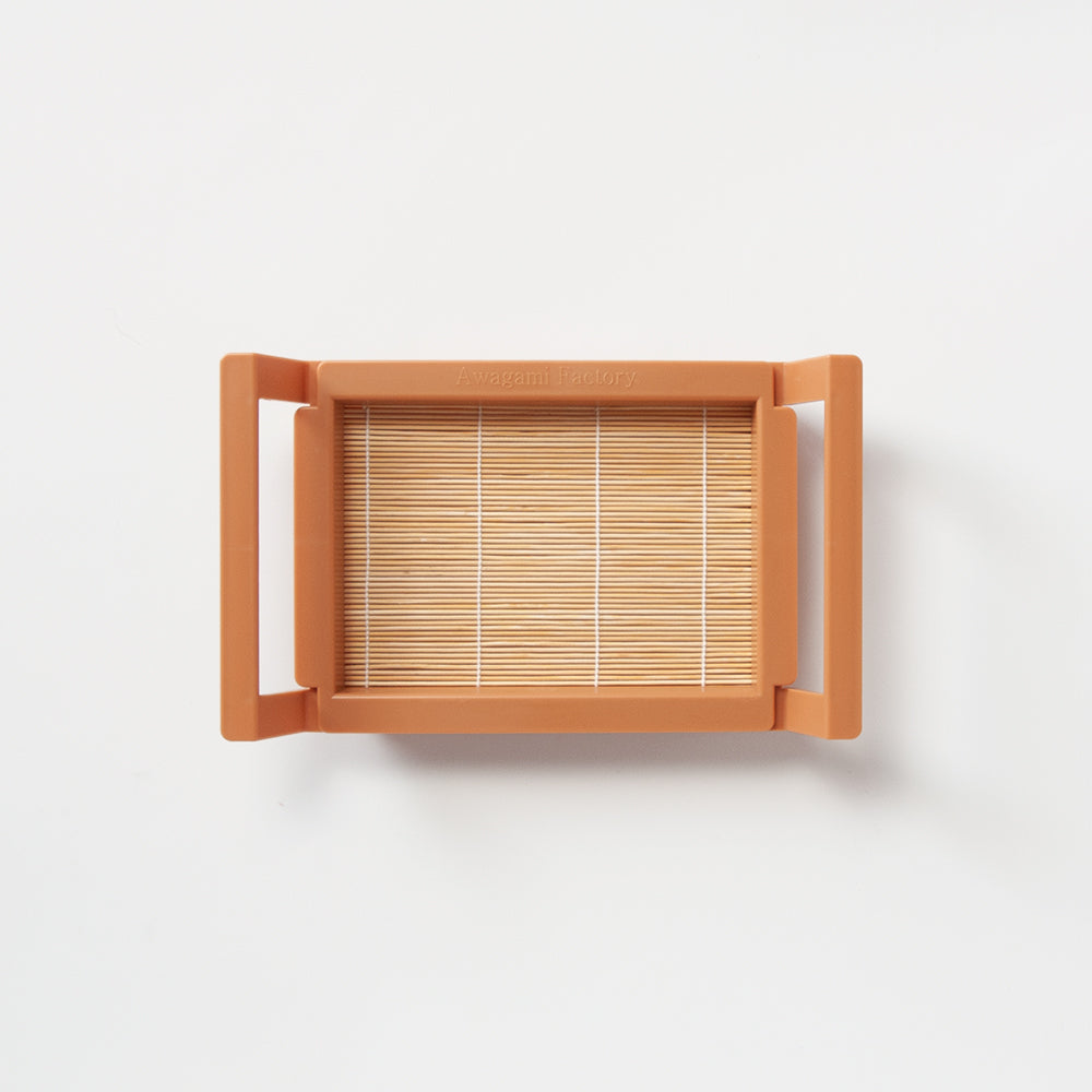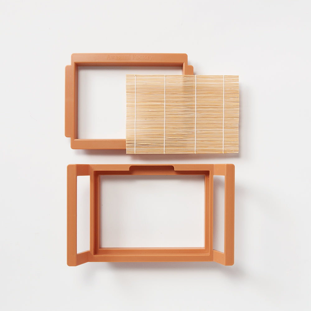 ハガキ用の紙漉き簀桁(紙すきすけた)です。小さいですが「竹簀(すだれ状)」を使っており、薄い紙から厚い紙まで漉くことができます。別売の原料もあります。原料は、牛乳パックを再生化(パルプ化)して使うこともできます。