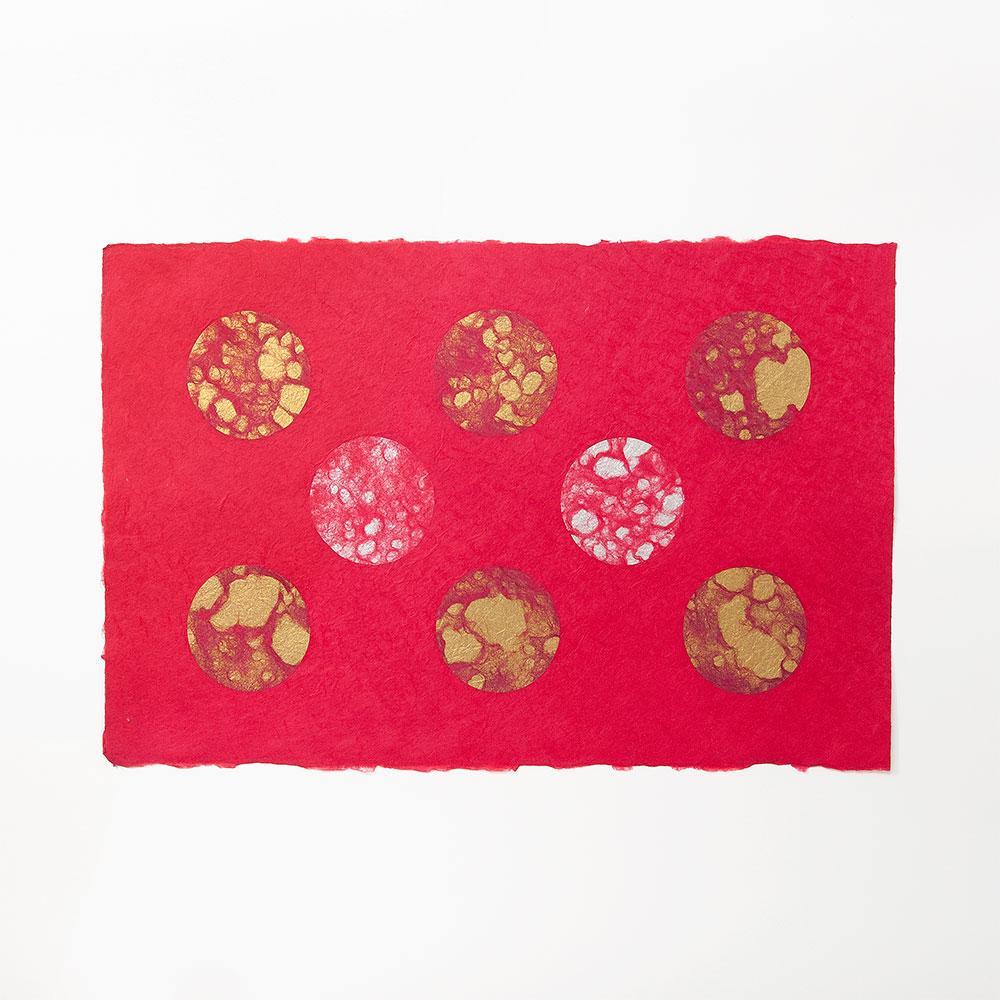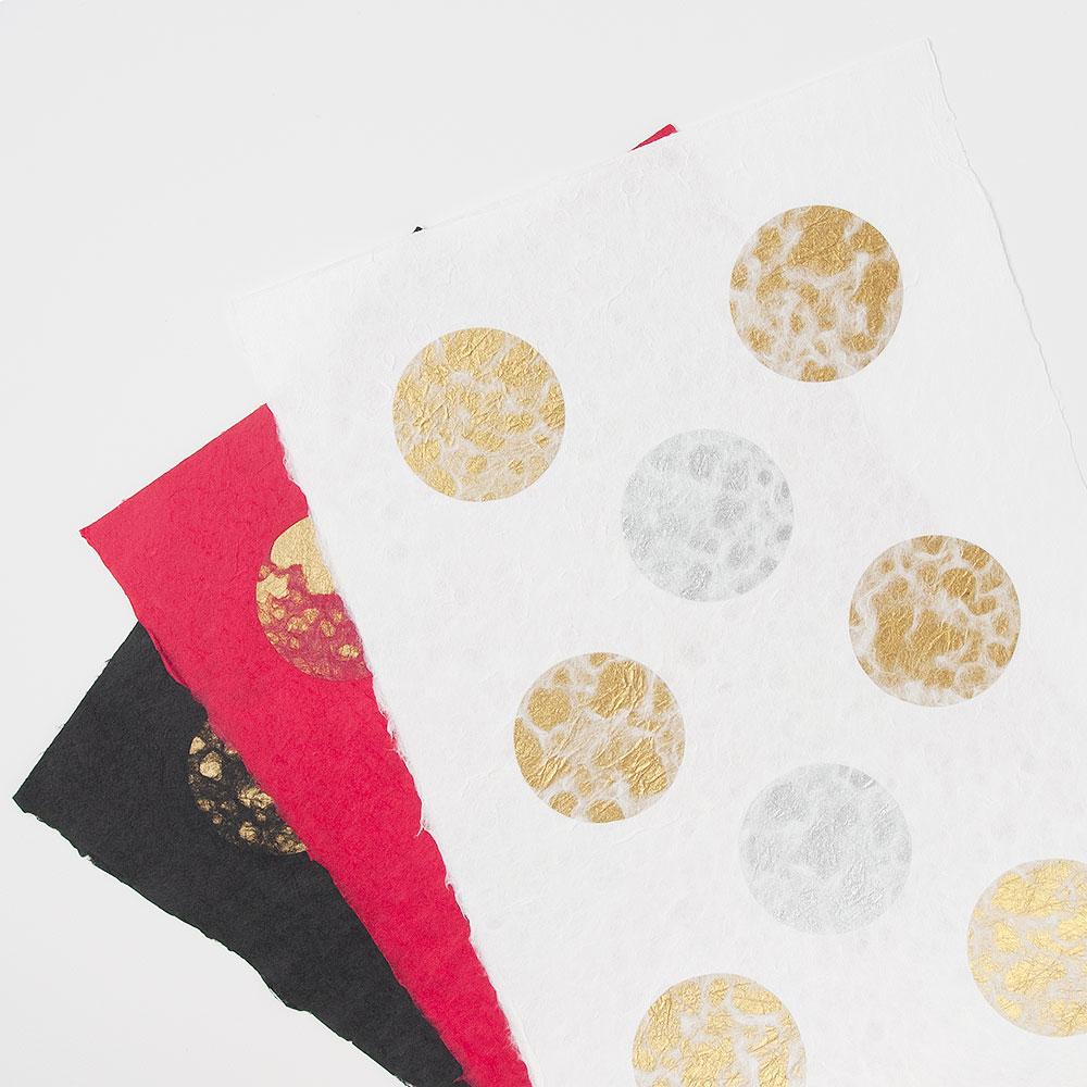 丸く切った金銀の和紙を漉き込みました。丸の直径は、約7.6 cmです。1〜2mmの誤差が生じる場合がございますがご了承ください。