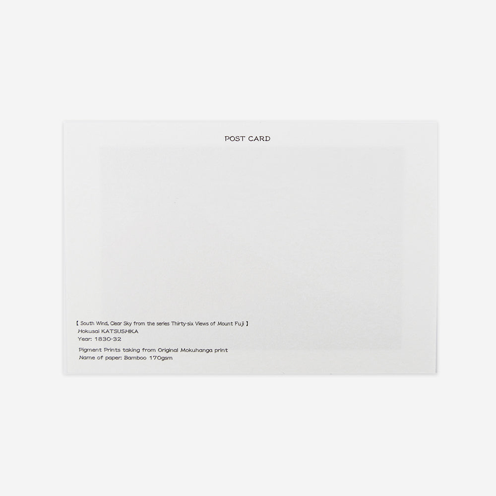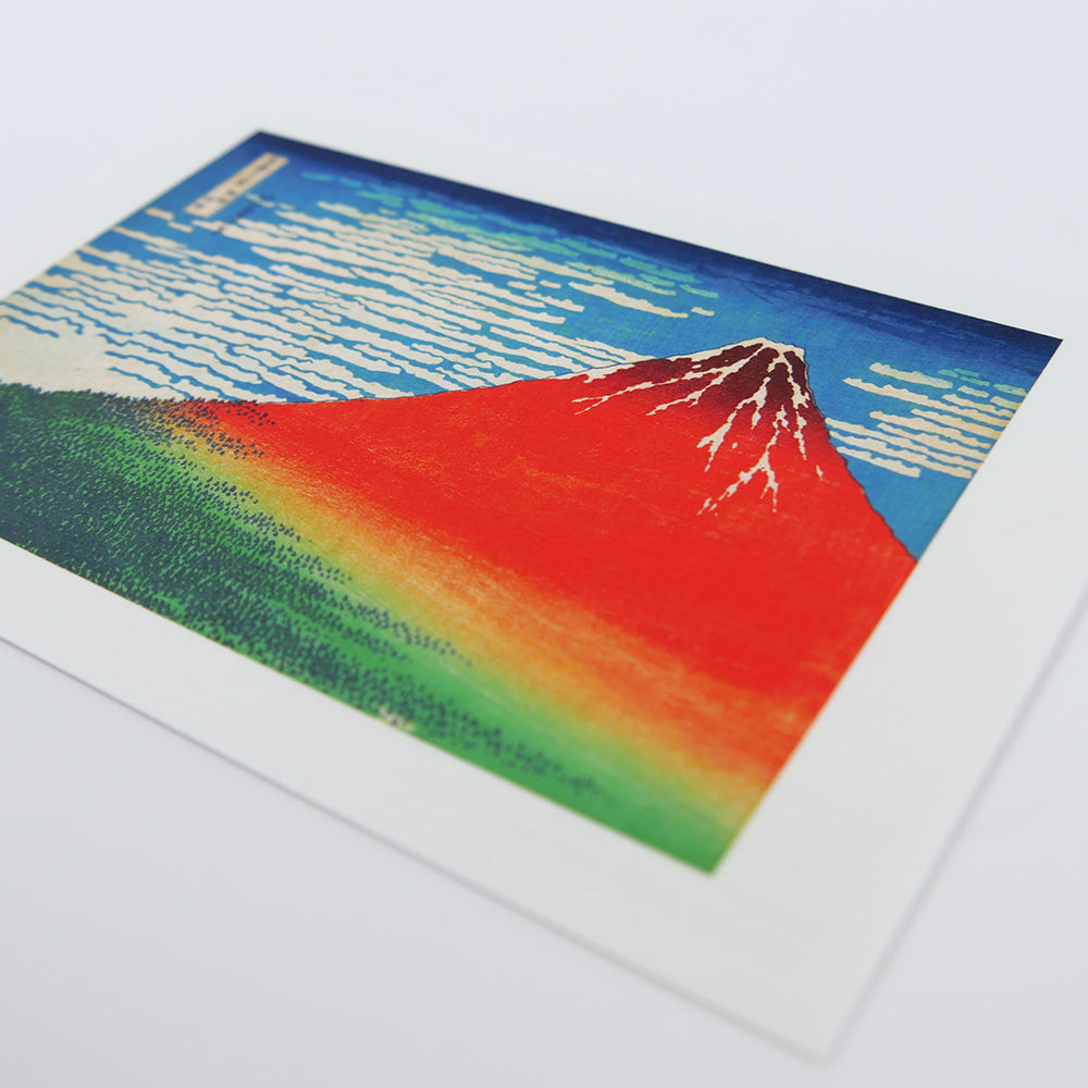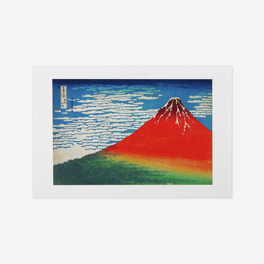江戸時代後期に活躍した葛飾北斎(1760〜1849)による名所絵で、各地から見られる富士山の景観を描いた『富嶽三十六景』全46図のうちの1つ。 通称『赤富士』とも呼ばれ、樹海を裾野に佇む富士を大きく正面から描かれ、空にたなびく鰯雲、頂の雪渓を臨む景観の臨場感は、北斎の作品の中でも逸品と評されています。