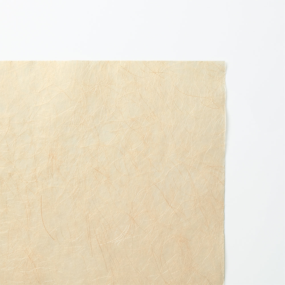 張りと光沢感が特徴である麻繊維を長く残して漉き入れた表情を「金」に見立てて名づけました。素材感にあふれ透光させることで美しさはより際立ちます。ラッピングやディスプレイ、クラフト材料に。