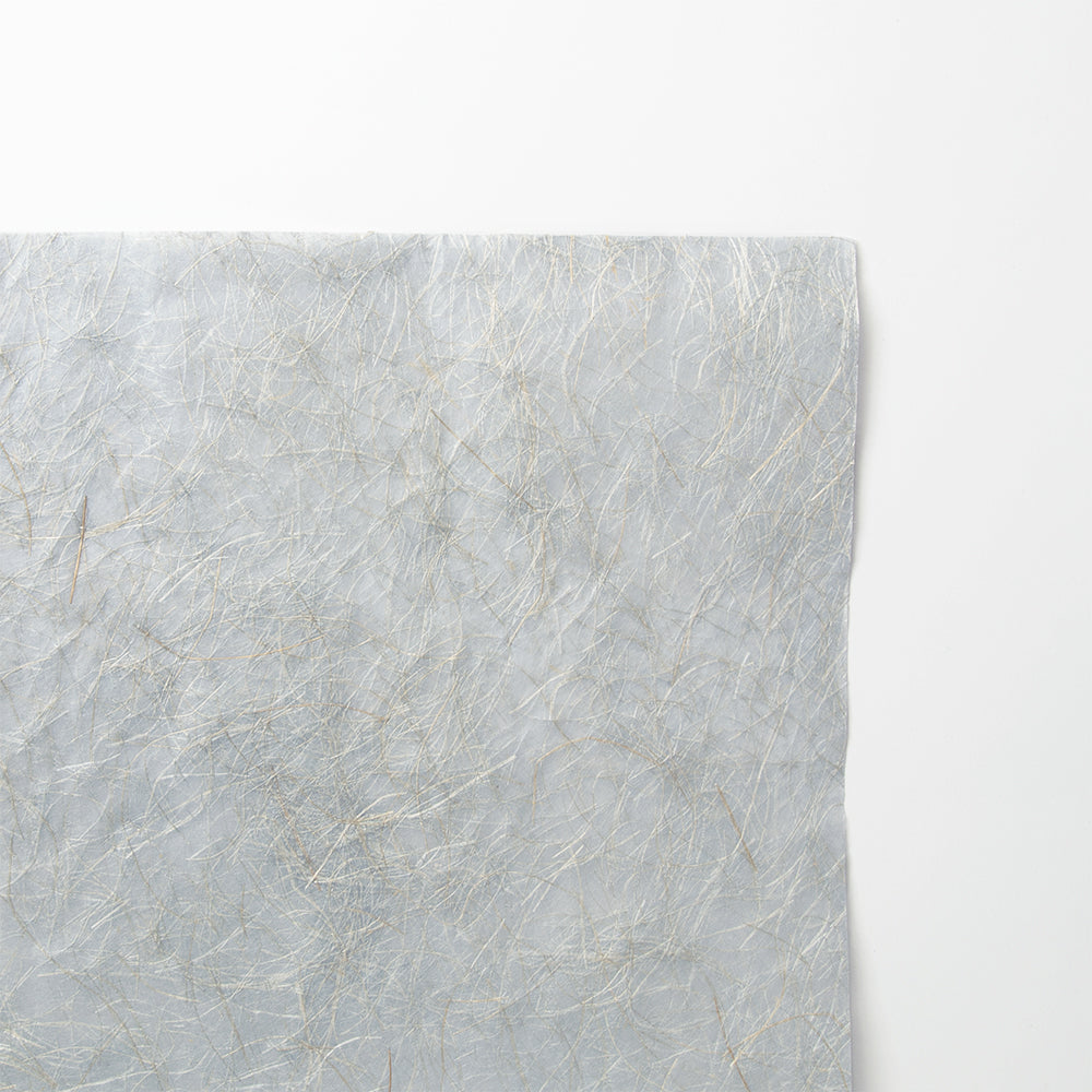 張りと光沢感が特徴である麻繊維を長く残して漉き入れた表情を「金」に見立てて名づけました。素材感にあふれ透光させることで美しさはより際立ちます。ラッピングやディスプレイ、クラフト材料に。