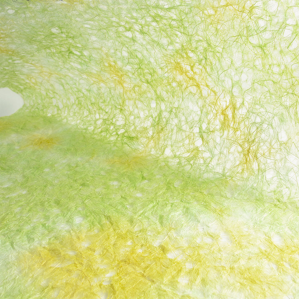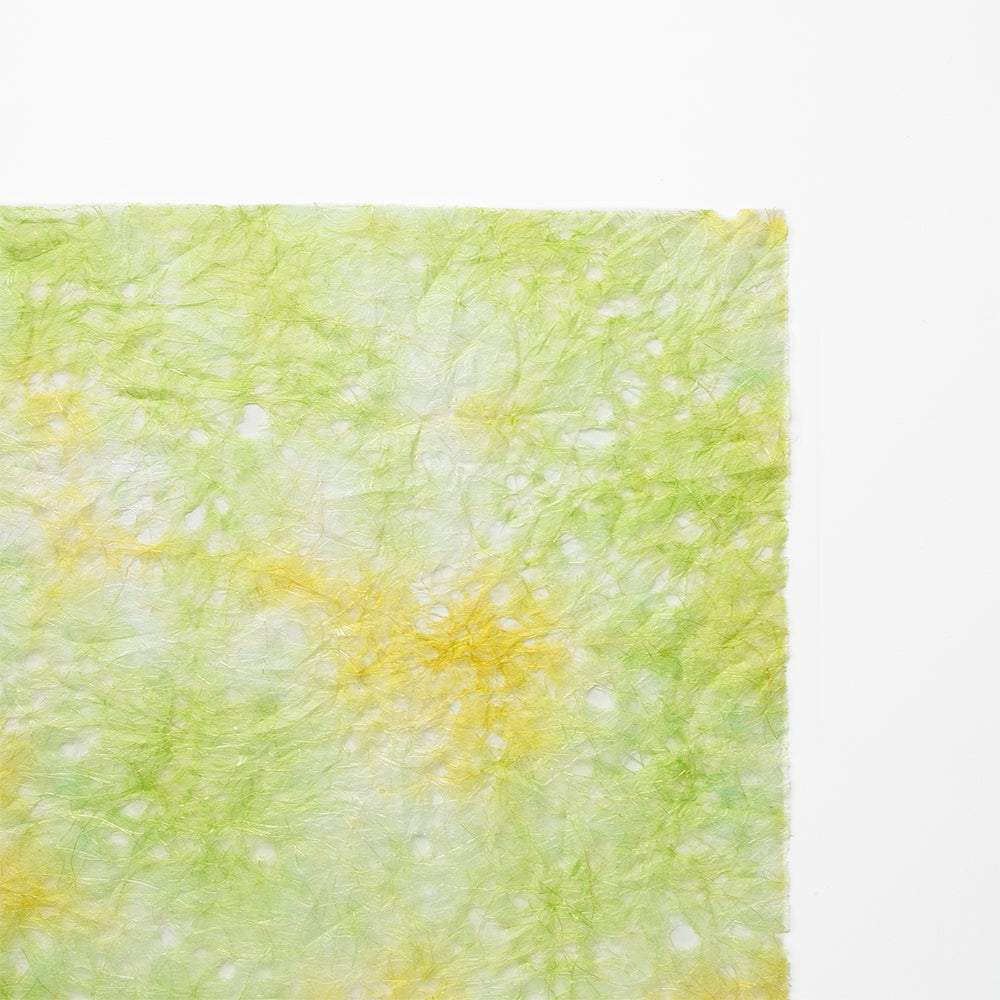 麻の自然な光沢感と、穴を開けることで涼しげな印象を与える「麻落水紙」を、もみ染めにしました。