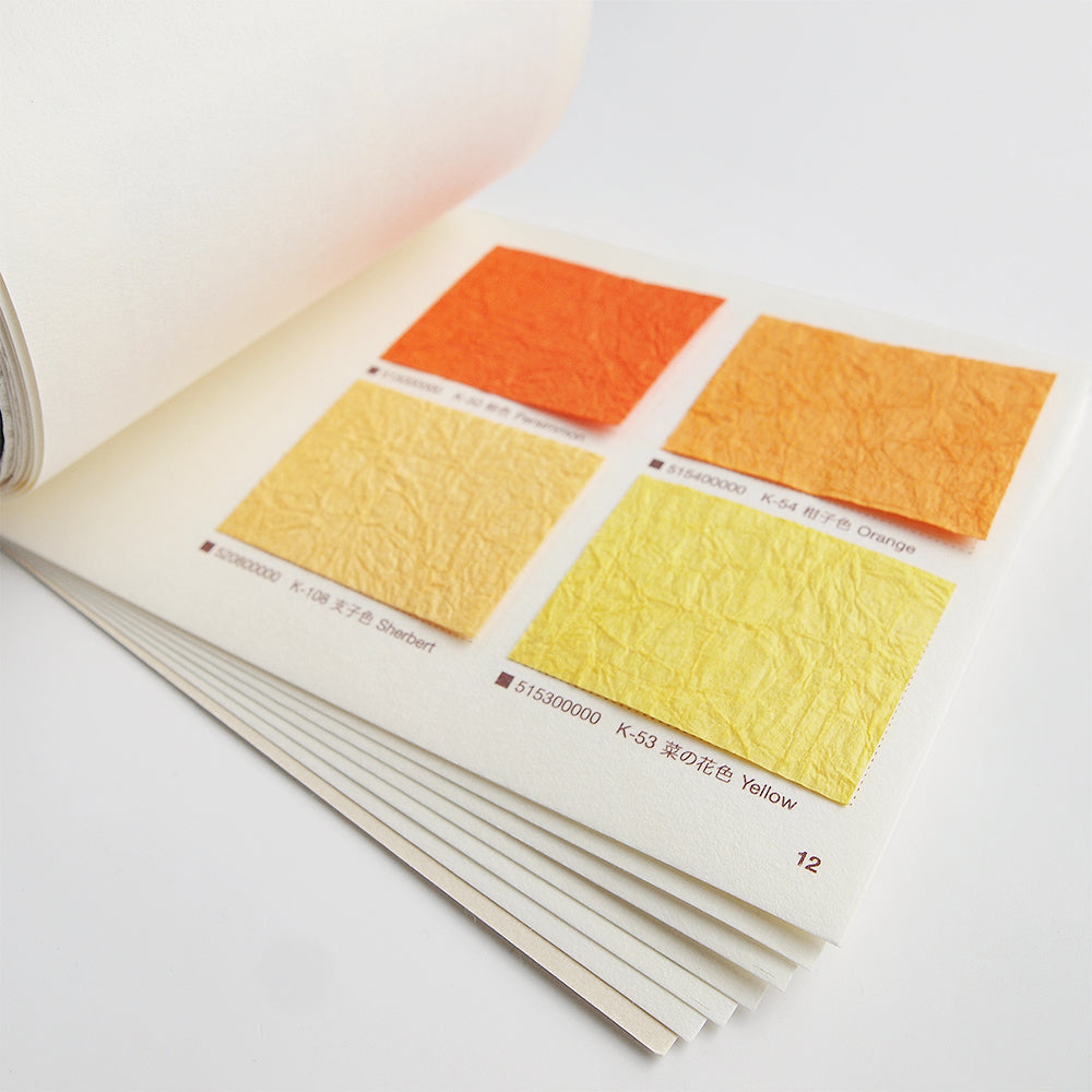 手揉みでしわ加工をほどこした「強制紙」の見本帳です。 3.5×4.5cmの紙チップを貼り付けており、全50色が一覧できるようになっております。 また、実際の紙の厚さや色、しわの入り具合を手にとって確かめていただけます。