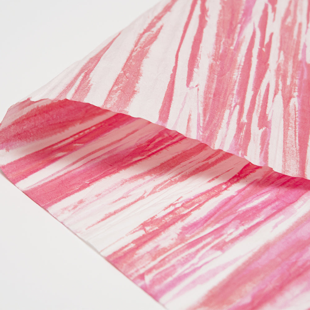 アワガミファクトリーで長年染められてきた「柳絞り染め紙」は、職人が一枚一枚手作業で楮紙を絞ってシワをつけ、刷毛で染めた和紙です。一つと同じものはない、一点ものの柄が特徴です。