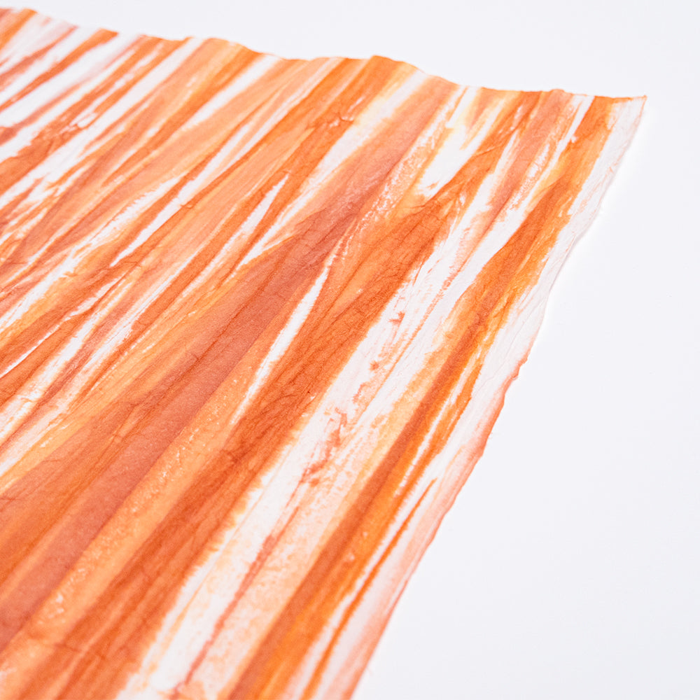 アワガミファクトリーで長年染められてきた「柳絞り染め紙」は、職人が一枚一枚手作業で楮紙を絞ってシワをつけ、刷毛で染めた和紙です。一つと同じものはない、一点ものの柄が特徴です。
