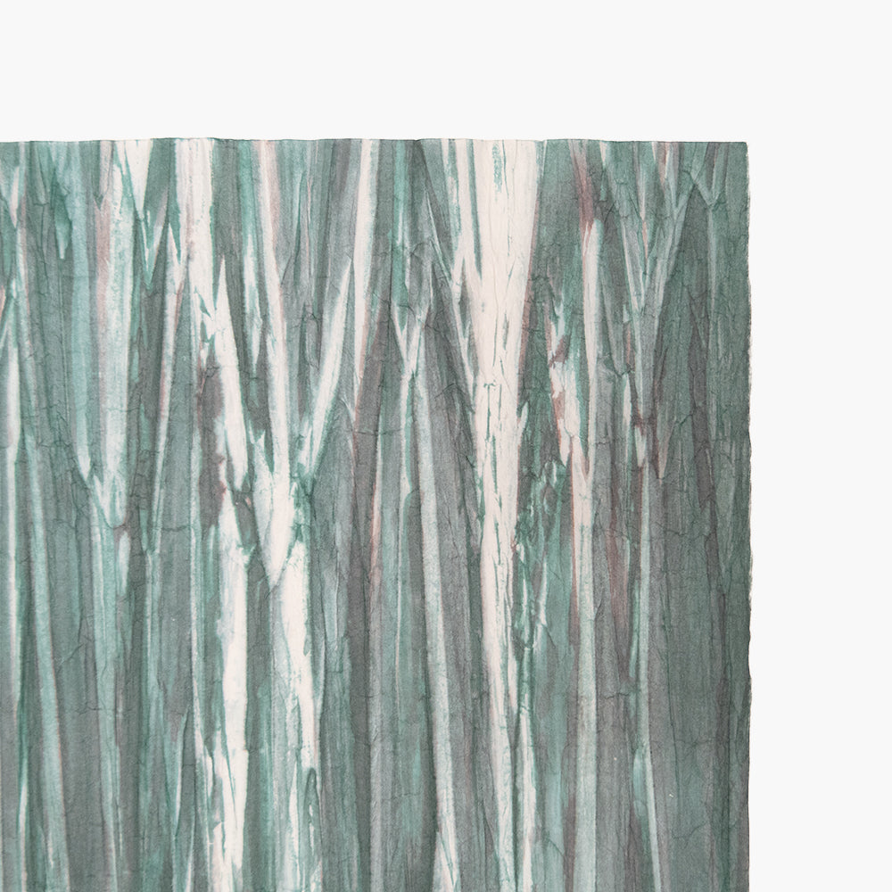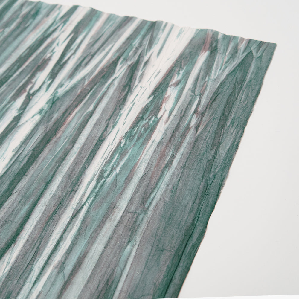 アワガミファクトリーで長年染められてきた「柳絞り染め紙」は、職人が一枚一枚手作業で楮紙を絞ってシワをつけ、刷毛で染めた和紙です。一つと同じものはない、一点ものの柄が特徴です。