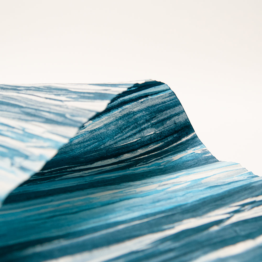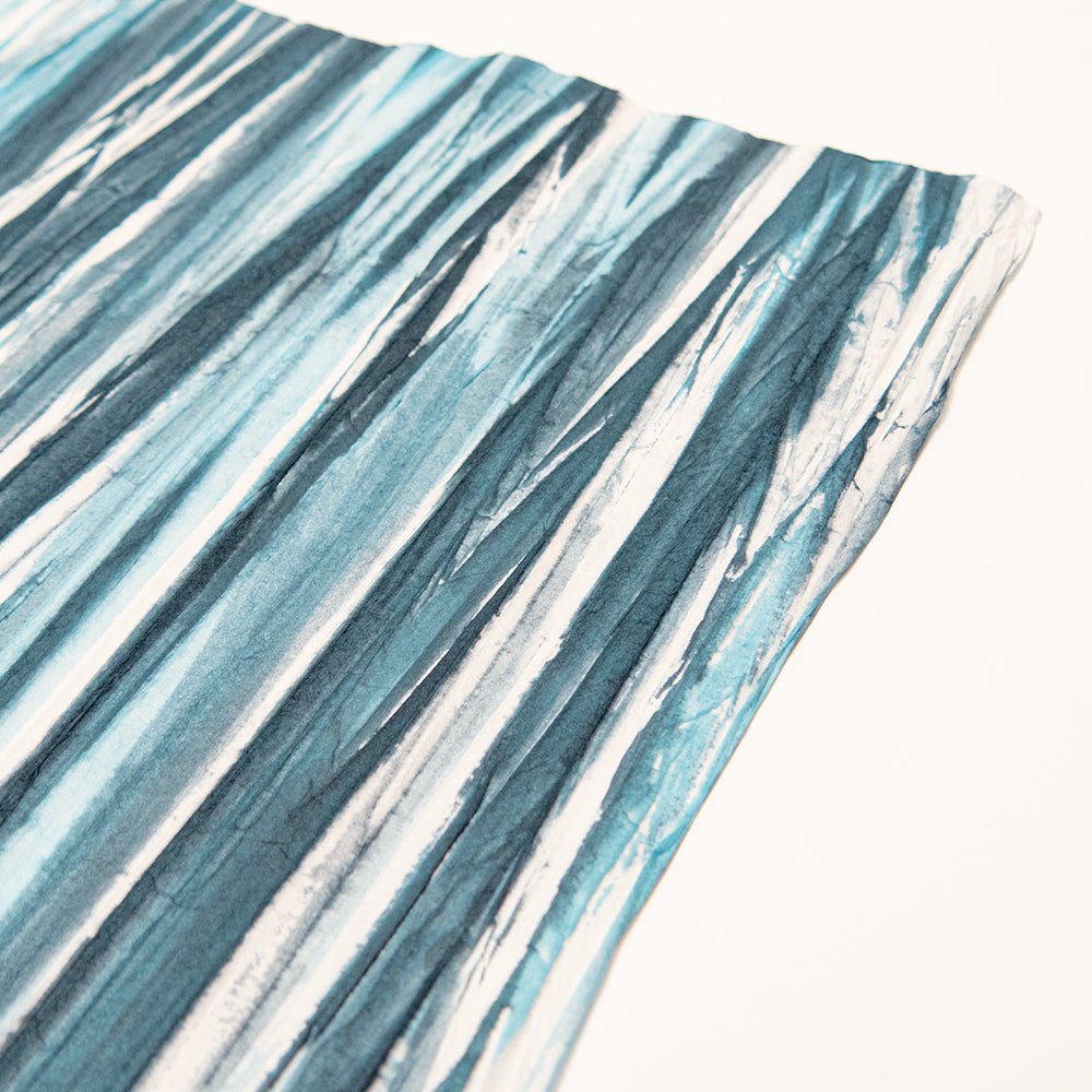 アワガミファクトリーで長年染められてきた「柳絞り染め紙」は、職人が一枚一枚手作業で楮紙を絞ってシワをつけ、刷毛で染めた和紙です。一つと同じものはない、一点ものの柄が特徴です。