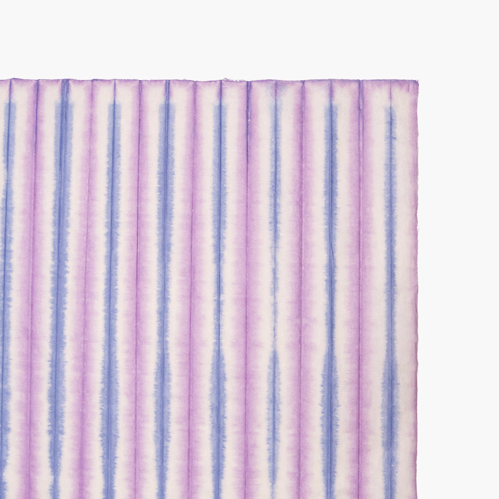 アワガミファクトリーで長年染められてきた「縞染め紙」は、職人が一枚一枚手作業で楮紙を折り、板締め染めの技法で染めた和紙です。