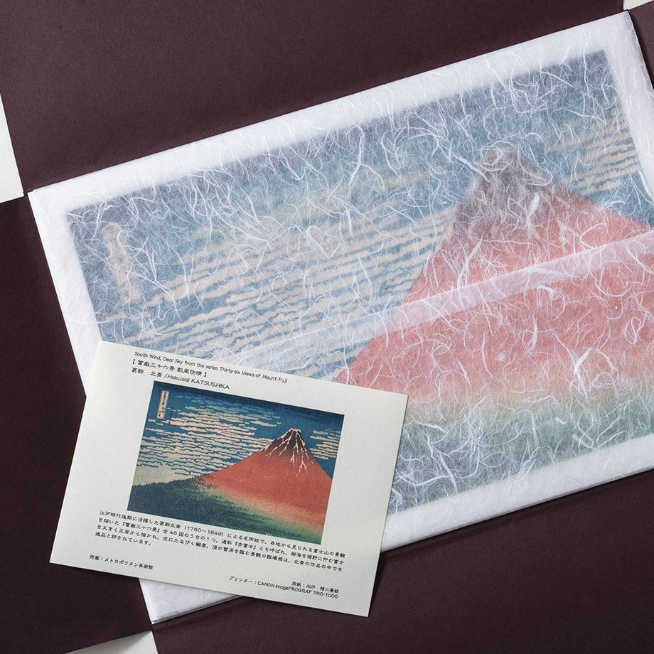 江戸時代後期に活躍した葛飾北斎(1760〜1849)による名所絵で、各地から見られる富士山の景観を描いた『富嶽三十六景』全46図のうちの1つ。 通称『赤富士』とも呼ばれ、樹海を裾野に佇む富士を大きく正面から描かれ、空にたなびく鰯雲、頂の雪渓を臨む景観の臨場感は、北斎の作品の中でも逸品と評されています。