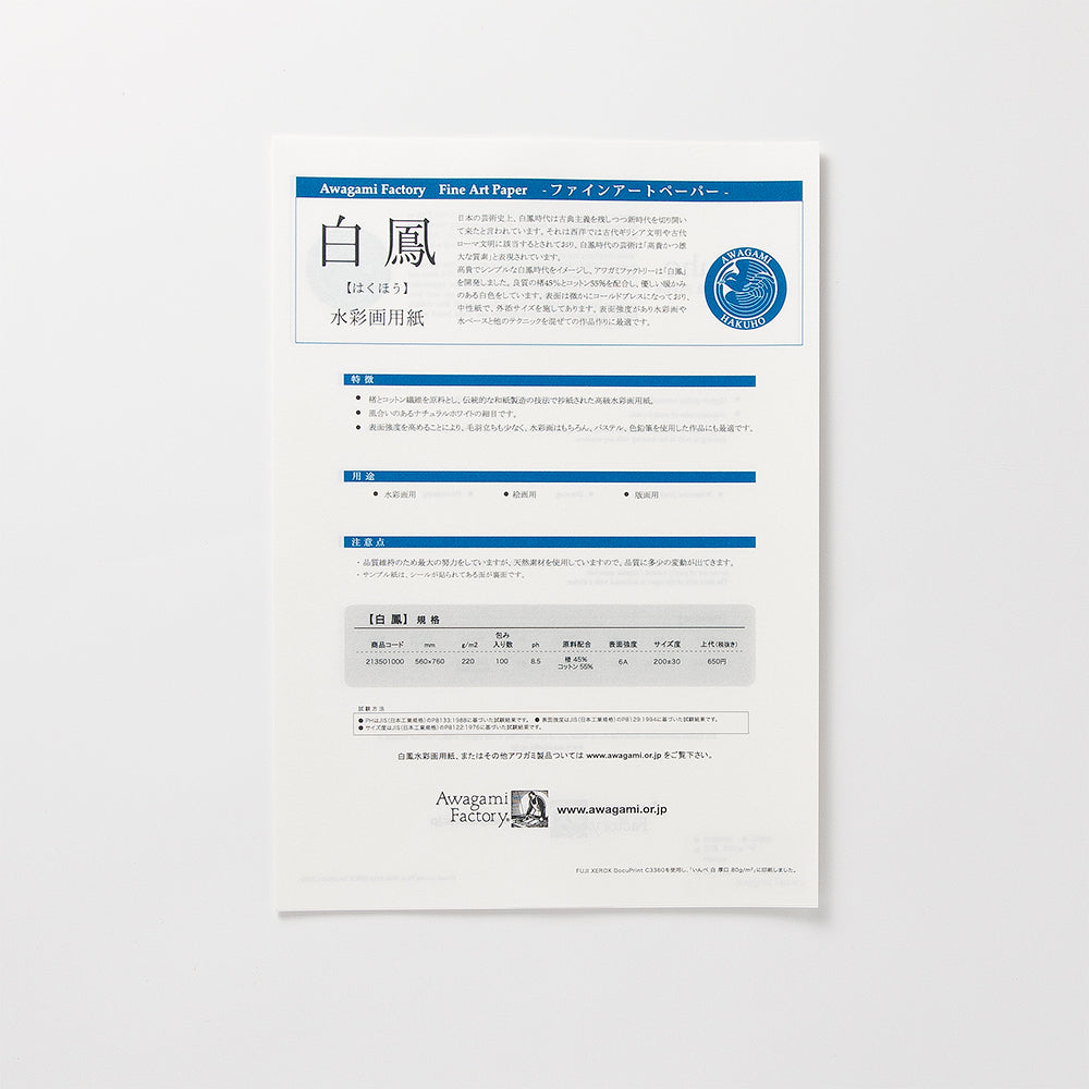 高貴でシンプルな白鳳時代をイメージし、アワガミファクトリーは「白鳳」を開発しました。良質の楮とコットンを配合し、優しい暖かみのある白色をしています。表面は微かにコールドプレスになっており、中性紙で、外添サイズを施してあります。表面強度があり水彩画や水ベースと他のテクニックを混ぜての作品作りに最適です。