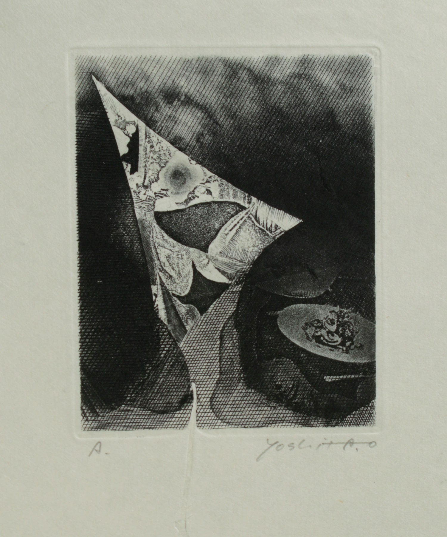 エッチングで線彫をした後、アクアチントを数回行い、その後一部朴墨で研磨して調子を出す。エンボス。