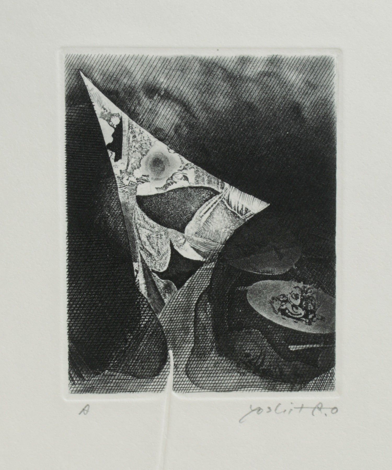 エッチングで線彫をした後、アクアチントを数回行い、その後一部朴墨で研磨して調子を出す。エンボス。