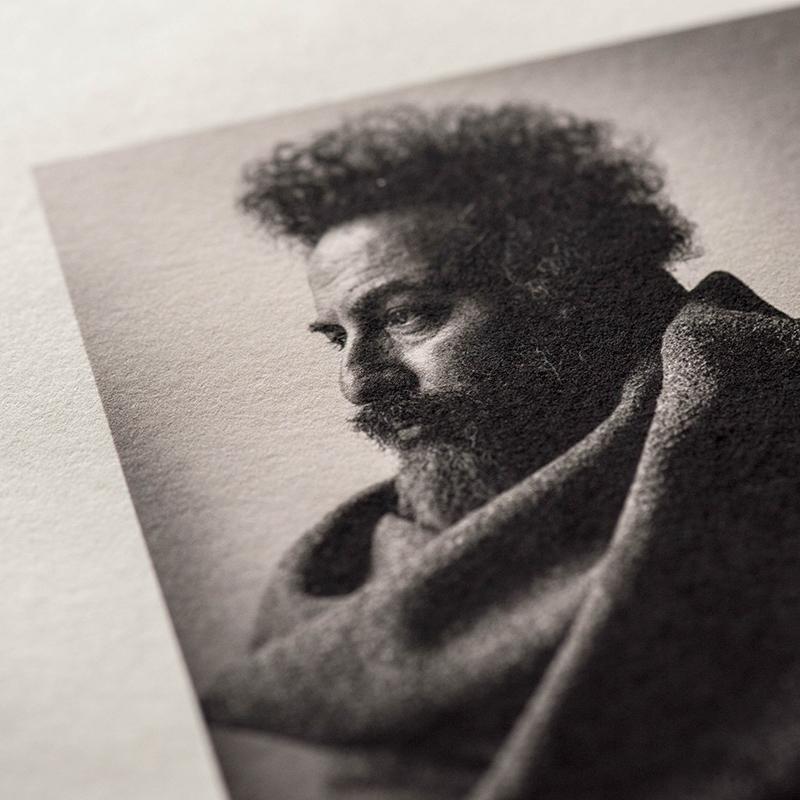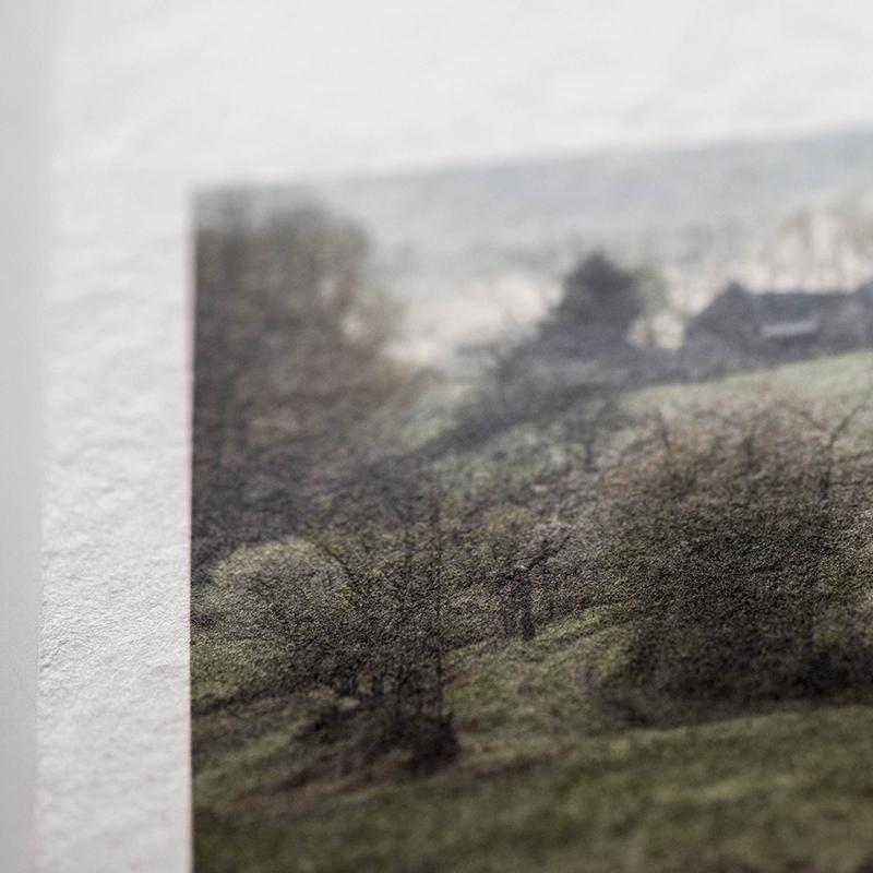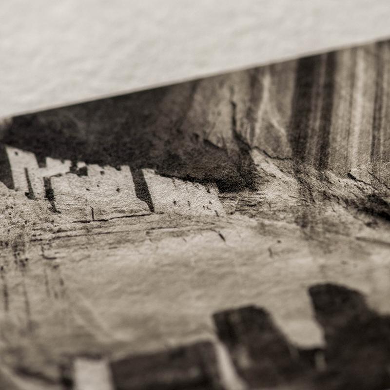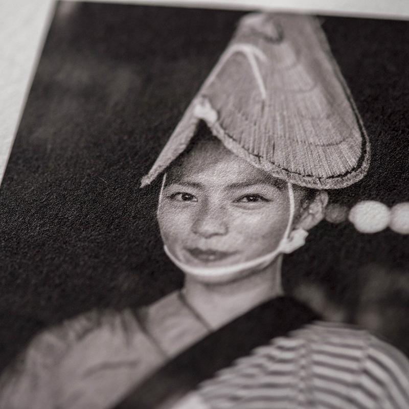 シンプルを極めるモノクロ作品こそ、素材と画像とのコーディネートにはこだわりたい部分でもありますそこで、「楮(生成)」や「三椏二層紙」など、紙色が自然な生成の色味が特徴的な素材も、ぜひお試し下さい。黄みがかった紙色に黒のインクがより深く映え、モノクロ画像のどこか情緒的な雰囲気がより引き立てられます。