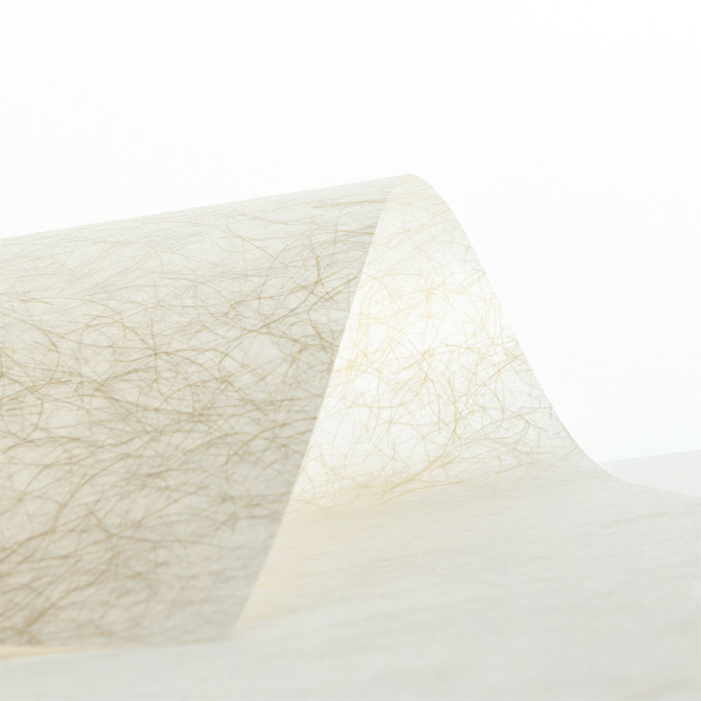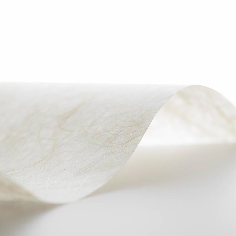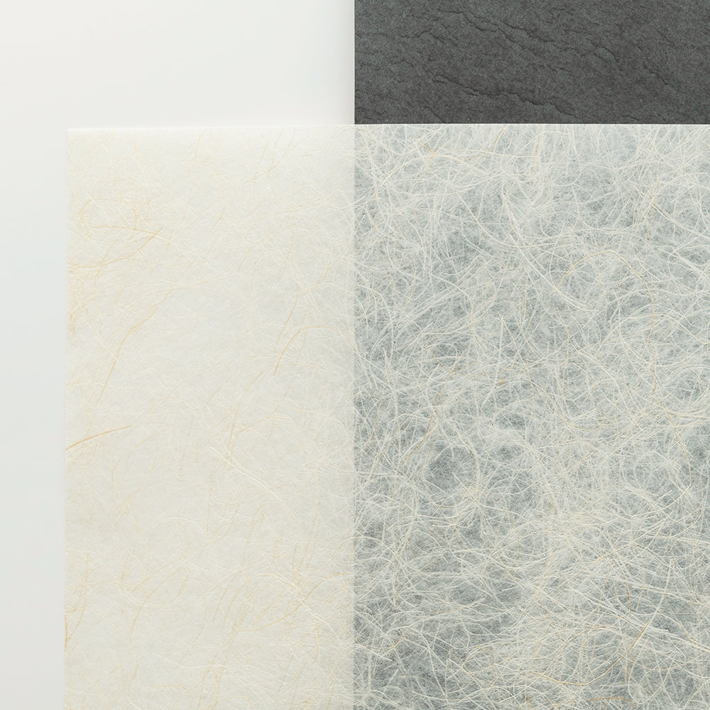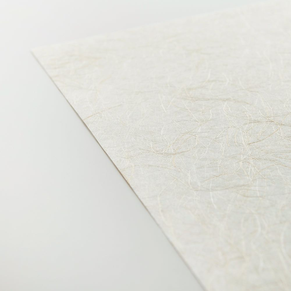 張りと光沢感が特徴の麻繊維を長く残して漉き入れた表情を、「金」に見立てて名づけた和紙です。